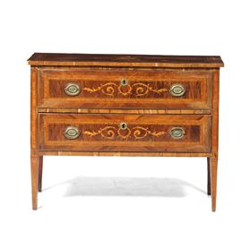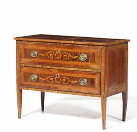 Fronte a due cassetti intarsiati a motivi vegetali, piano centrato da rosone