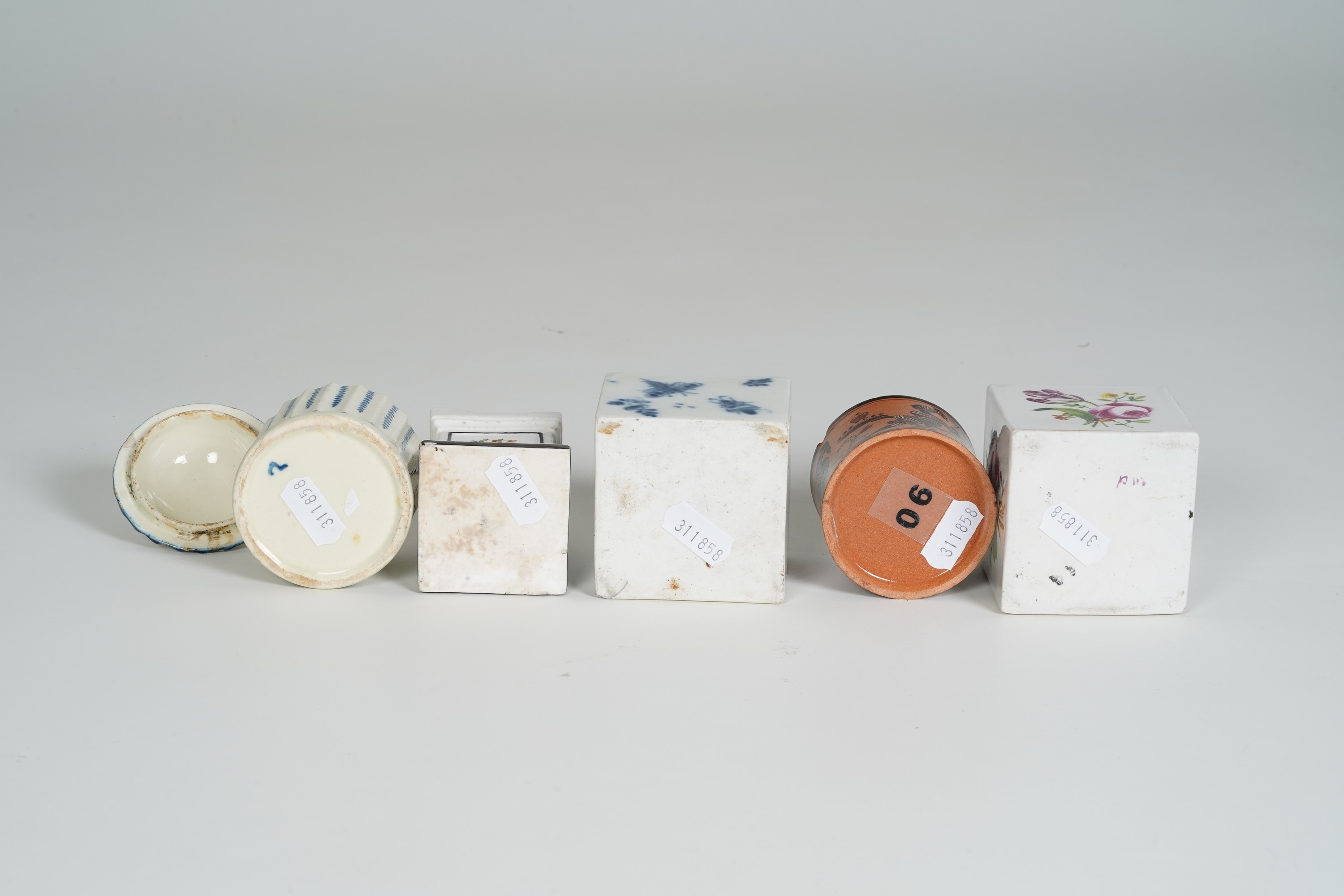Porcellana, terraglia, terracotta. Altezza massima cm 7,5. Conservazione: spargi polverino in terracotta con sbeccature ai bordi; uno in porcellana con restauri nella parte superiore; quello in terraglia con piccole sbeccature al coperchio.
