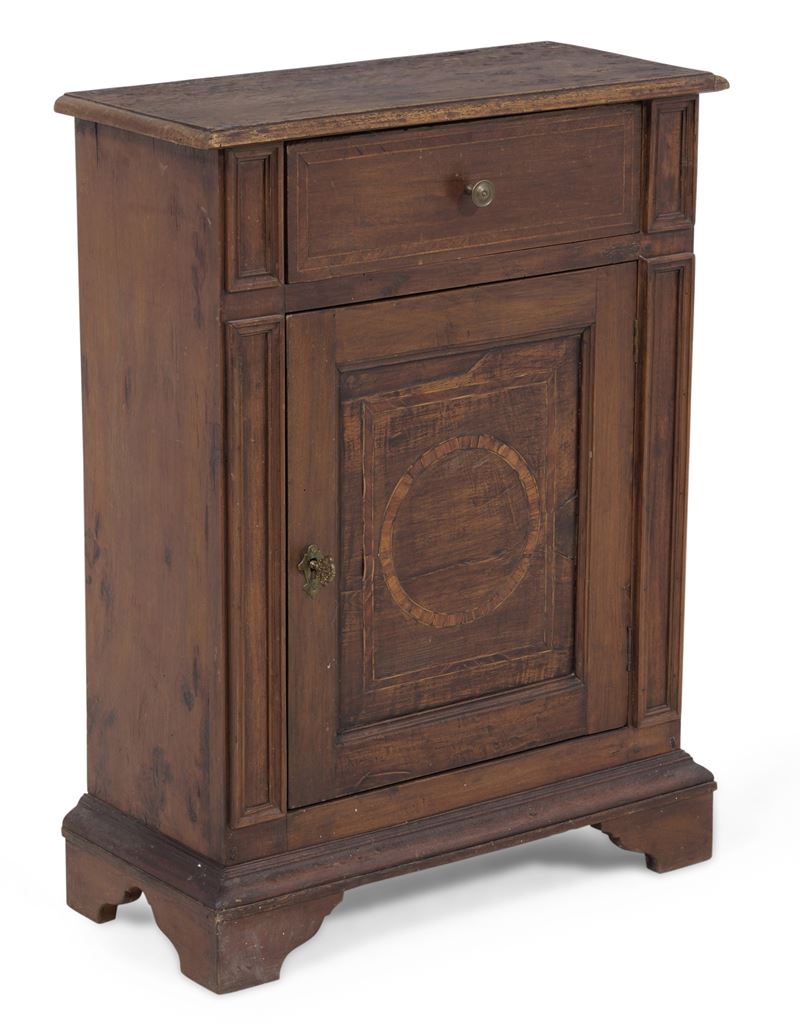 Comodino ad un’anta in legno intagliato e filettato. XIX secolo