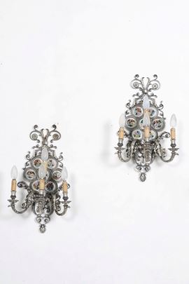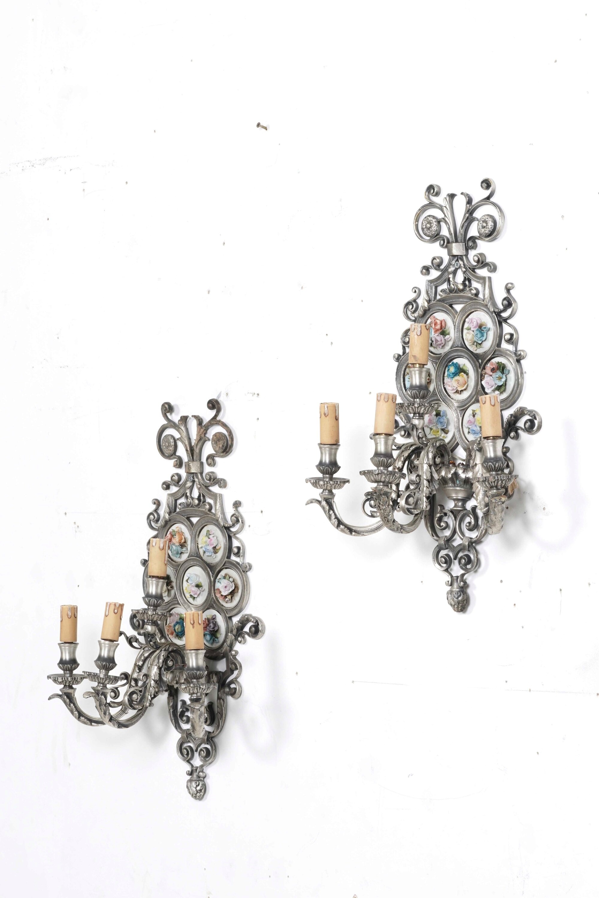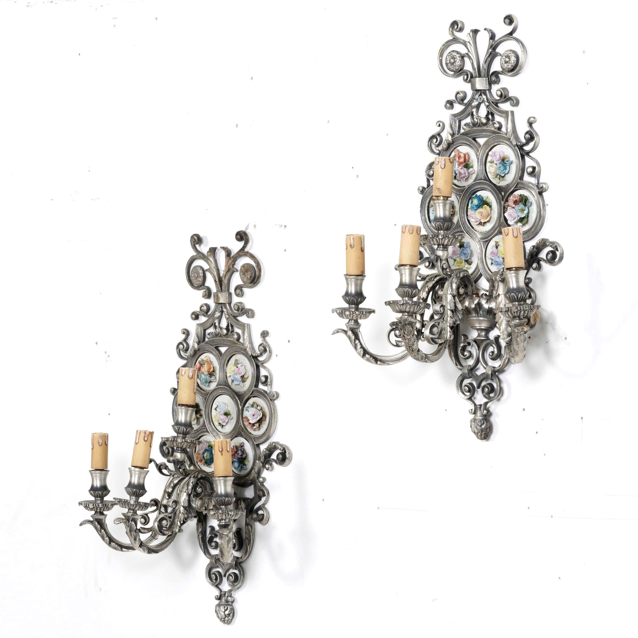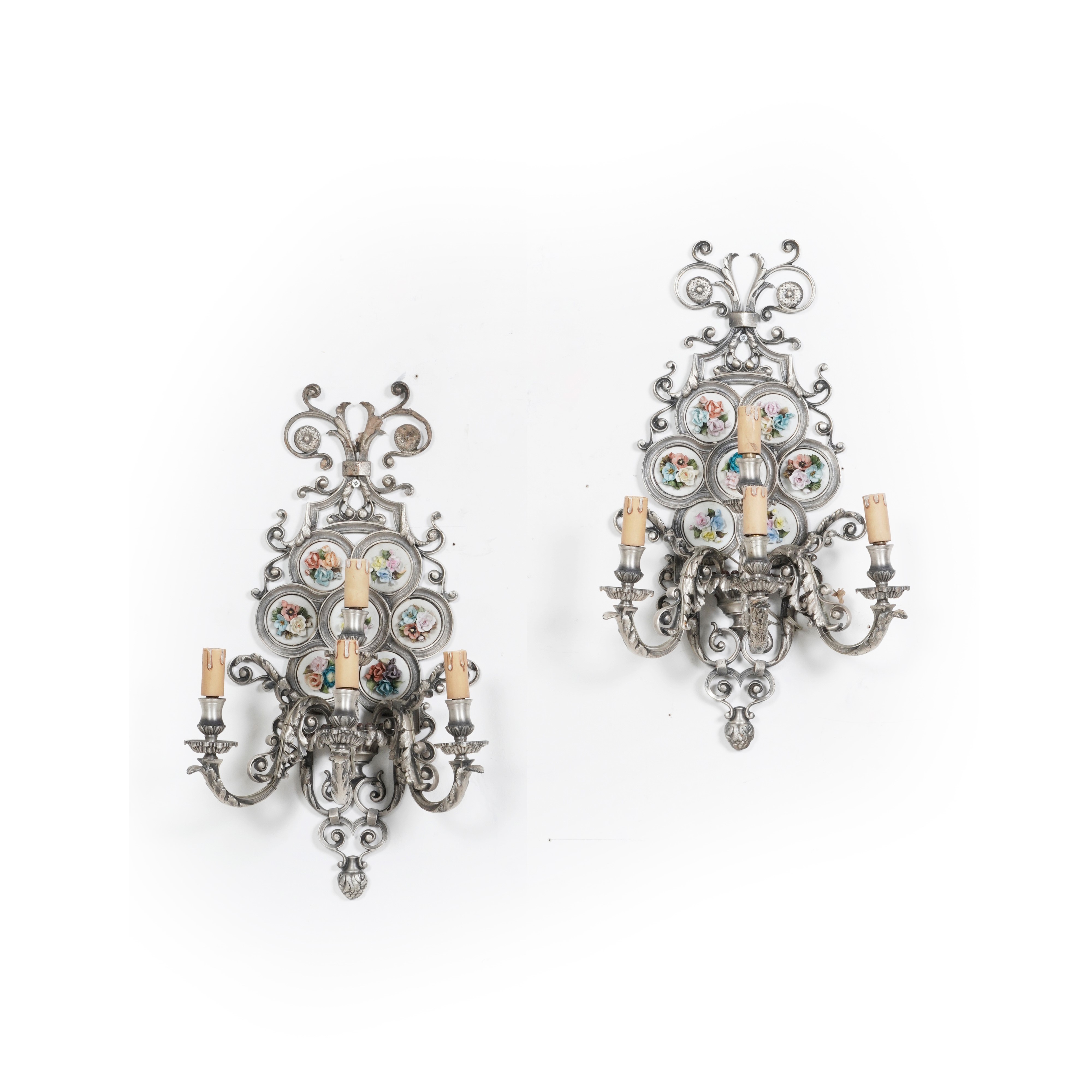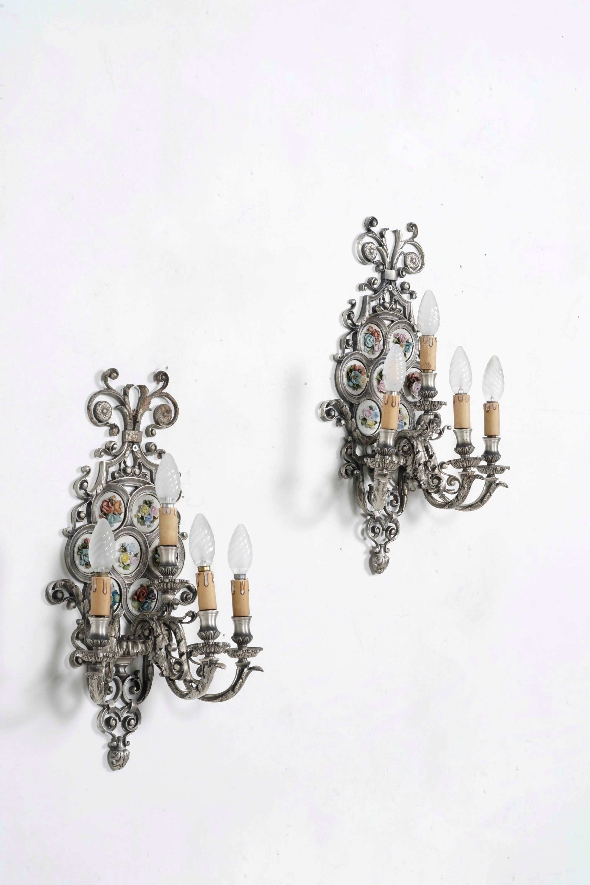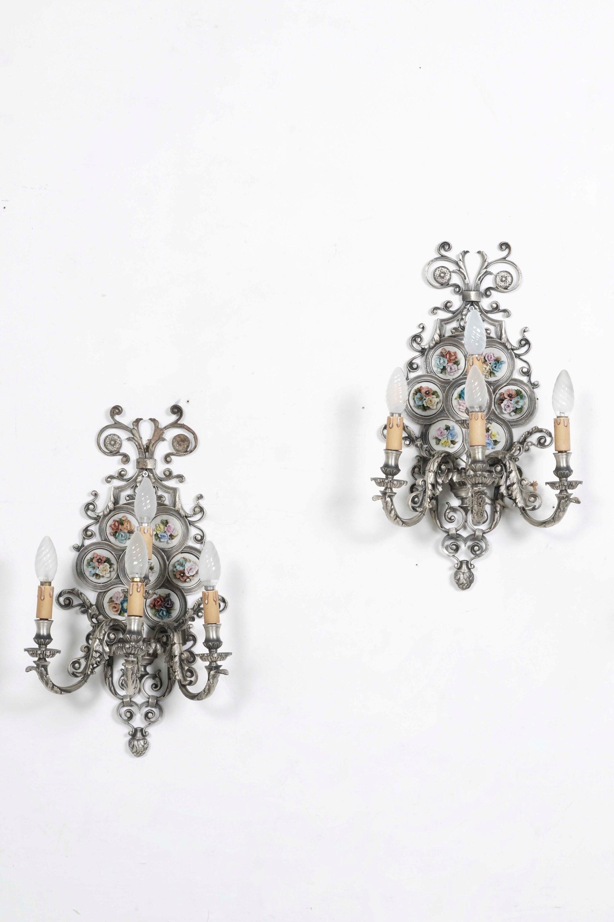 Coppia di appliques a quattro luci con placche floreali in porcellana policroma