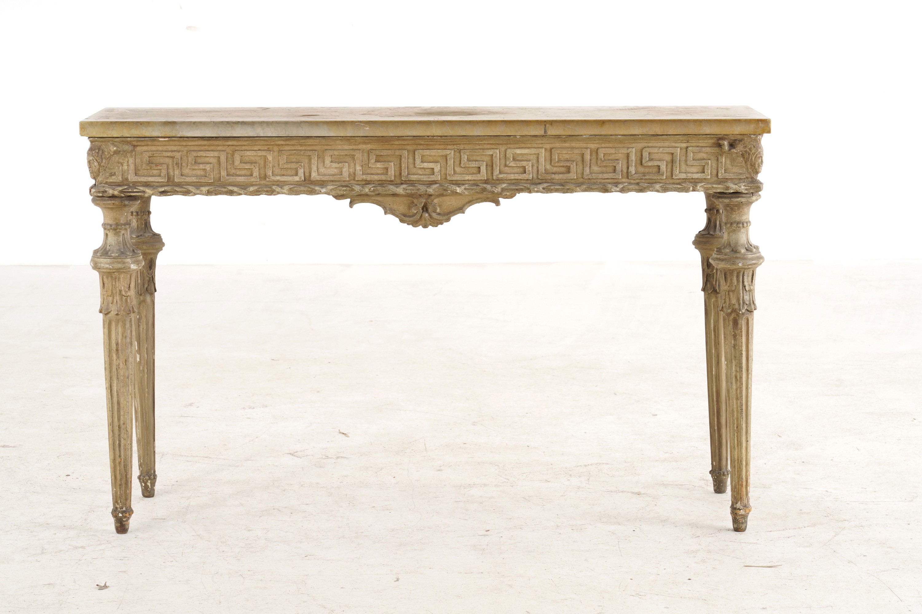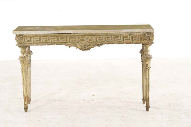 Fascia con decoro a greca, gambe troncoconiche scanalate, piano in marmo