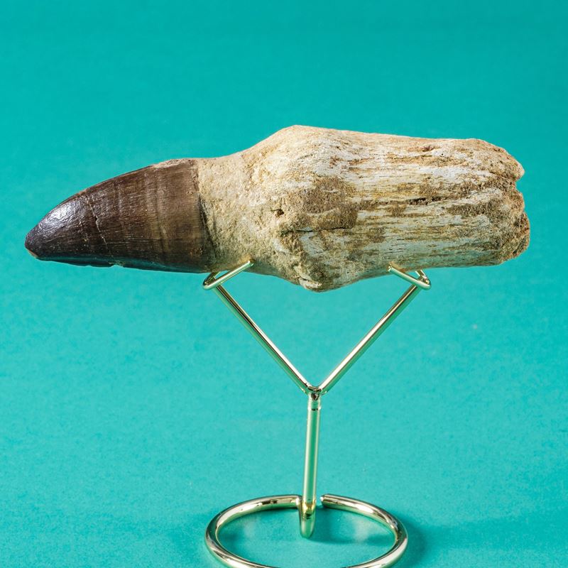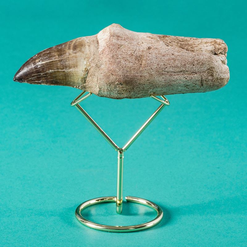 Enorme dente di Mosasaurus proveniente dal Marocco, completo di radice. Apparteneva a un esemplare adulto di grandi dimensioni. Rinvenuto nel Sahara nord-occidentale. Questo animale del Cretaceo era uno dei più grandi predatori marini.