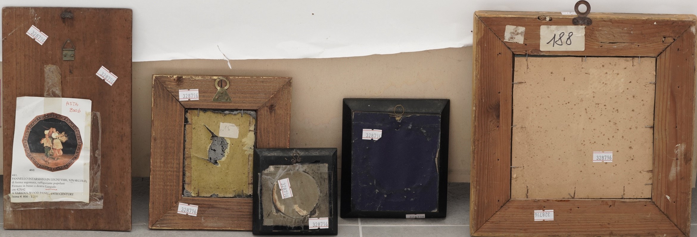 Due miniature, un piccolo ritratto in abiti settecenteschi, una stampa applicata su vetro con Maria che incontra Elisabetta, un intarsio con figura femminile