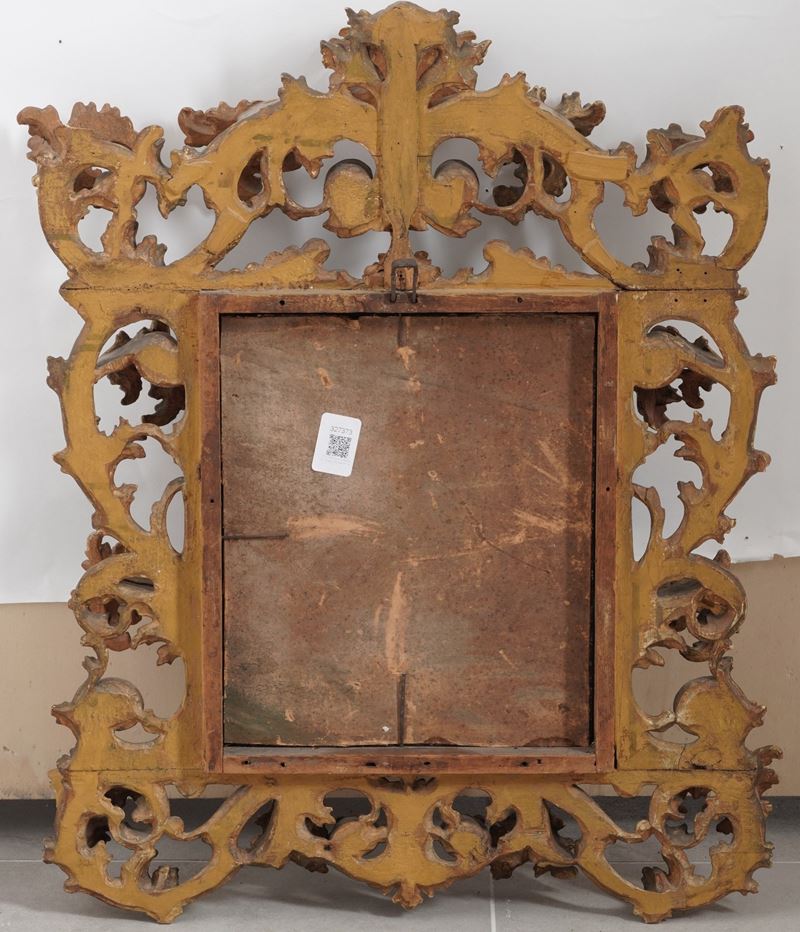 Piccola specchiera a cartoccio in legno intagliato e dorato. XIX-XX secolo