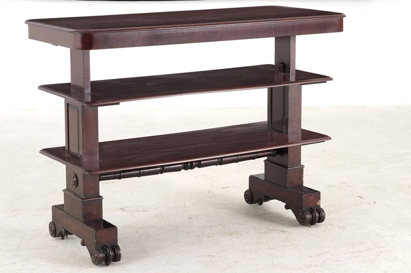 Regolabile in altezza, due ripiani fissi e uno regolabile, piedi intagliati a ricciolo