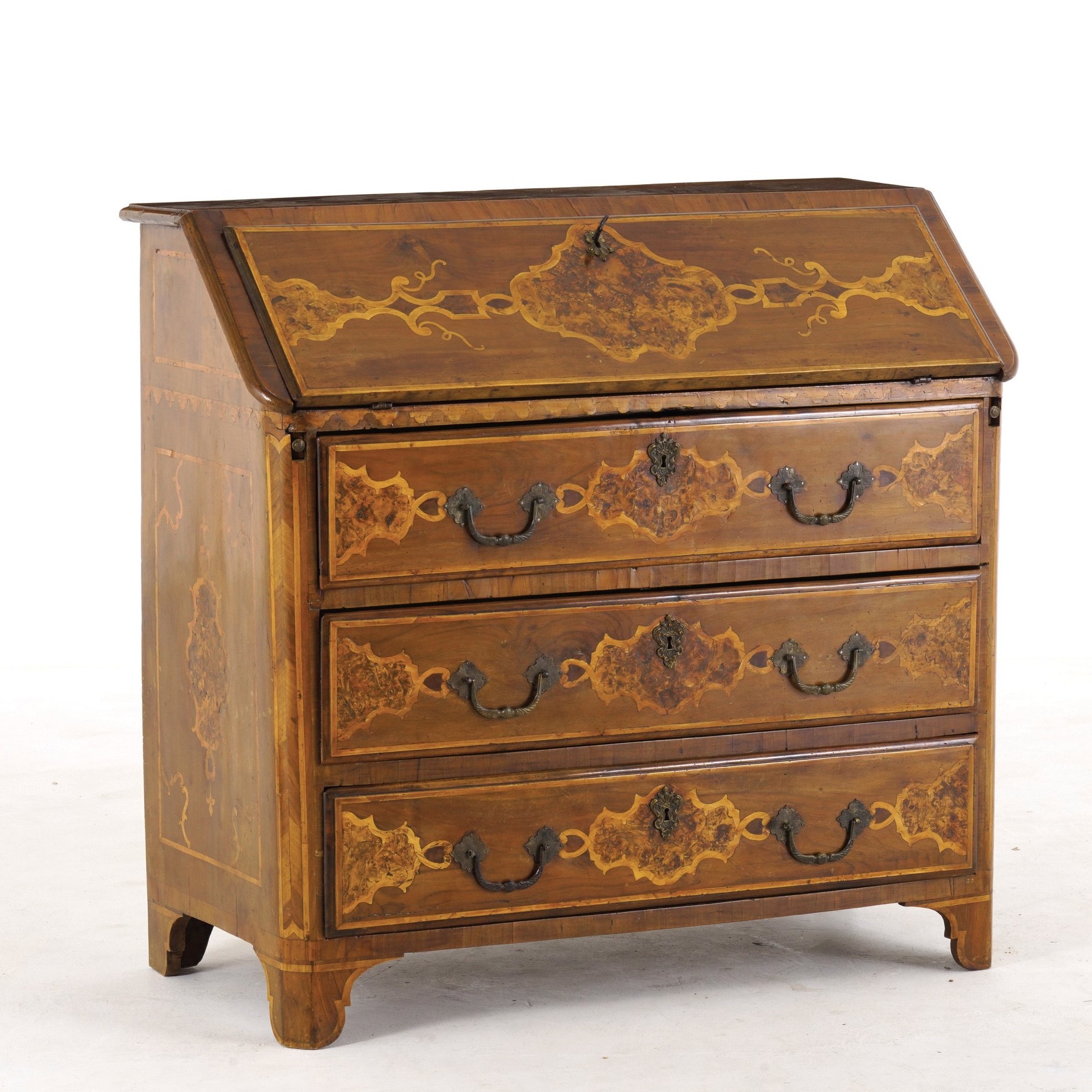 Fronte a tre cassetti e ribalta che cela cassettini e scomparti