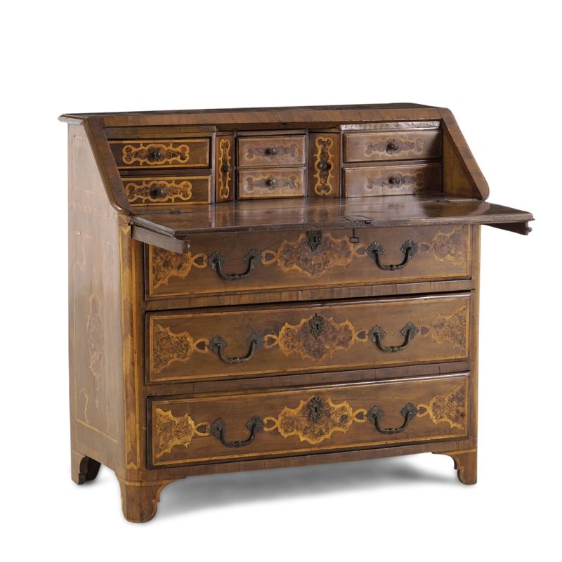Ribalta in noce intarsiata, filettata e parzialmente lastronata in radica. XVIII secolo