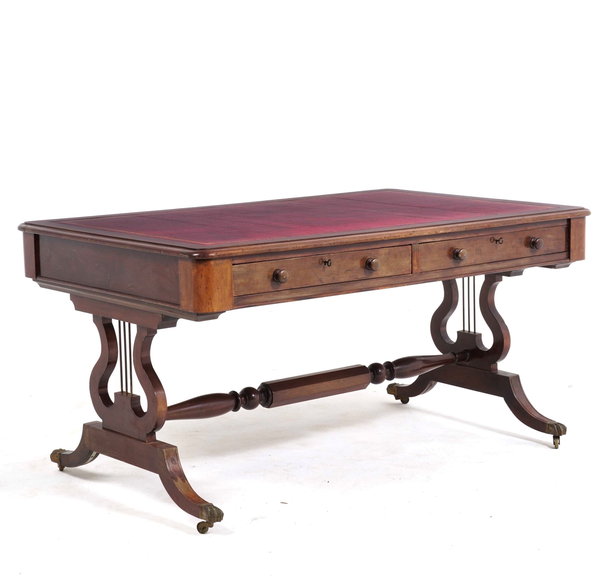 Gambe a lira riunite da traversa tornita, due cassetti nella fascia, piano foderato in cuoio