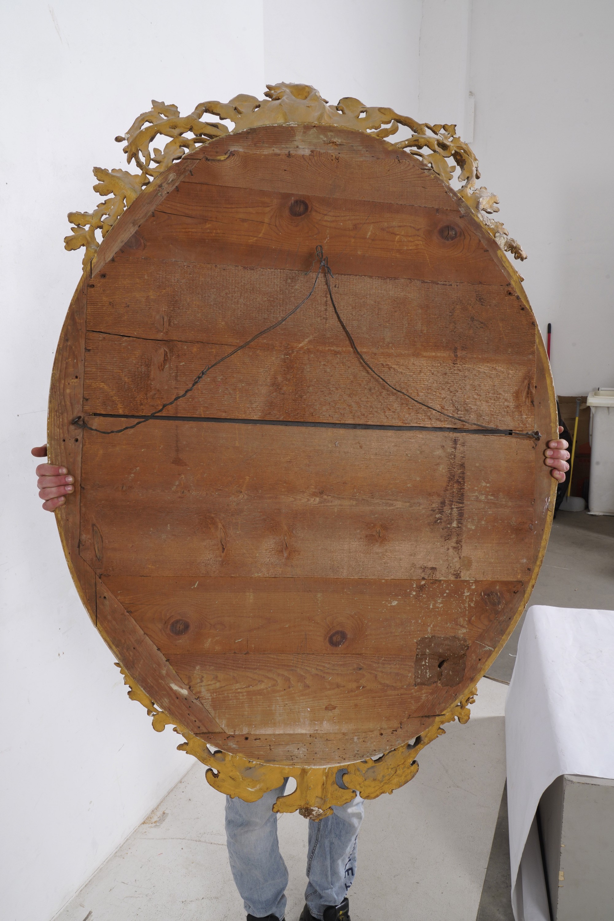 A riserva ovale. Cimasa con stemma retto da putti con girali e foglie, base con fregio a pellacce