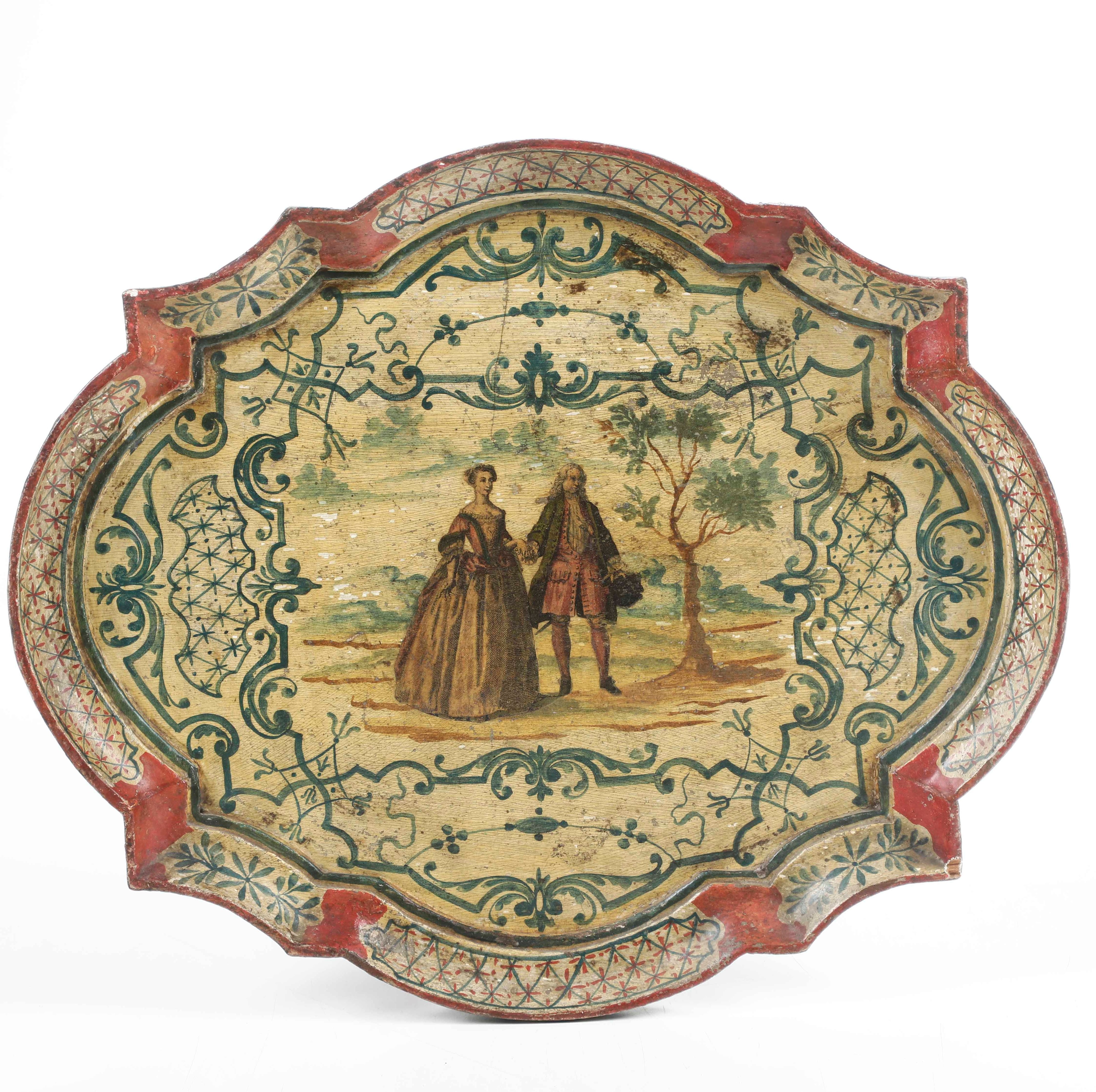 Vassoio in legno laccato e decorato ad arte povera. Venezia, XVIII-XIX secolo