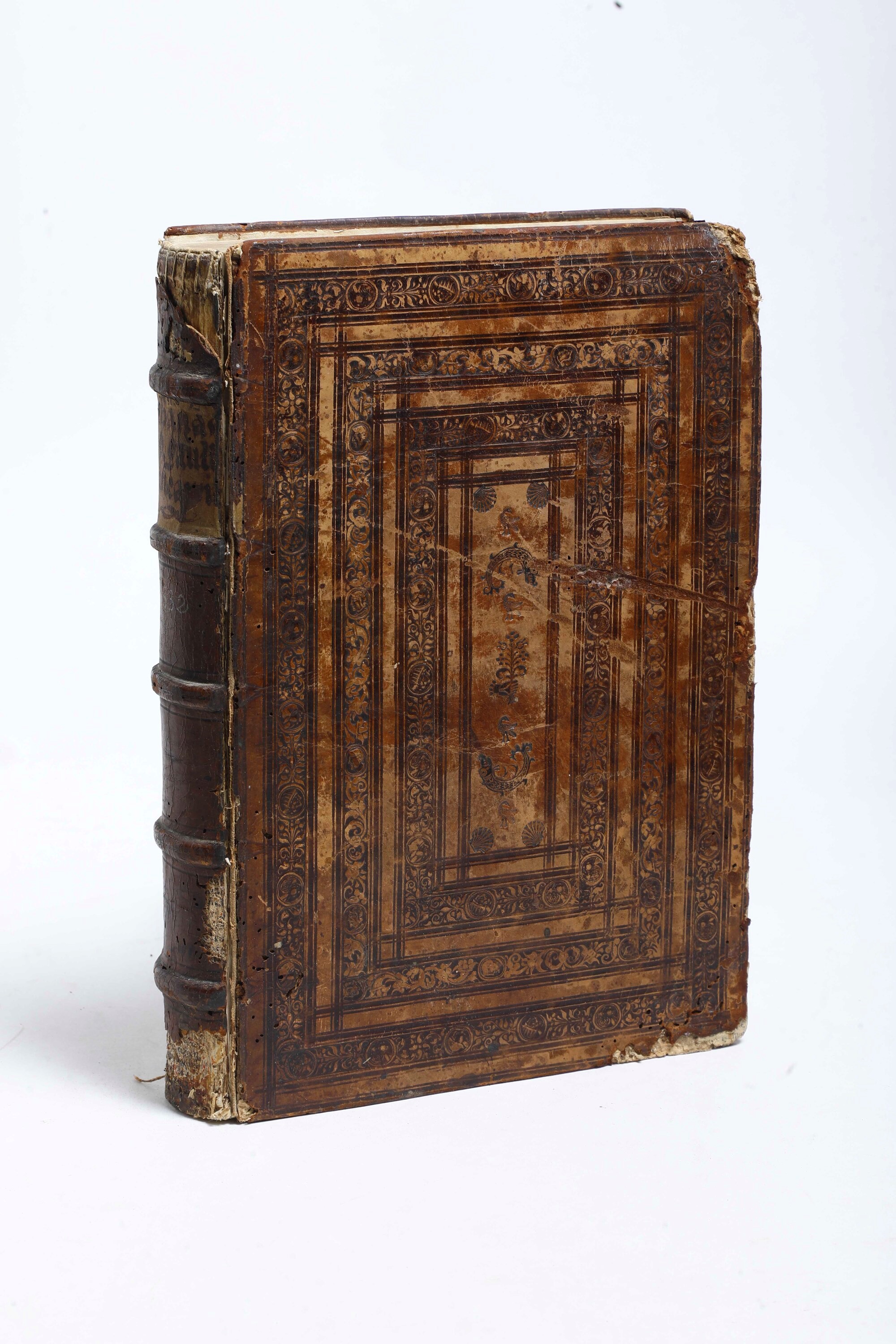 In-folio; [4], 314, [6]. Rilegatura coeva in piena pelle, con ricche decorazioni impresse a secco. Piatti staccati, dorso lacunoso alla testa e al piede, strappo alla seconda carta bruniture e altri difetti. Ex libris manoscritti al frontespizio. Alcune annotazioni marginali di mano coeva. Fori di tarlo che interessano alcune carte marginalmente