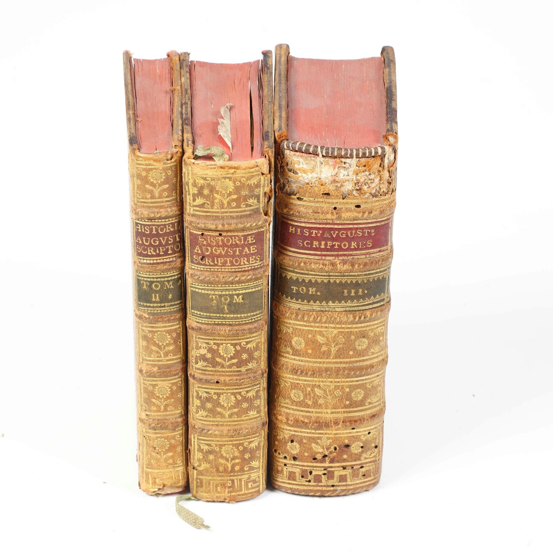 In 8°. Tre tomi. Rilegature in piena pelle del secolo XVIII con mancanze e abrasioni. Ex libris nobiliari ai contropiatti anteriori. Tracce di abrasioni al frontespizio del primo tomo. Discreto esemplare non esente da qualche macchia e brunitura