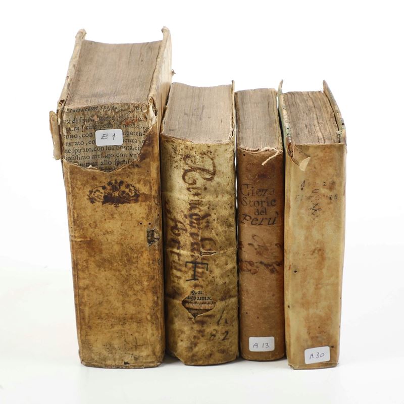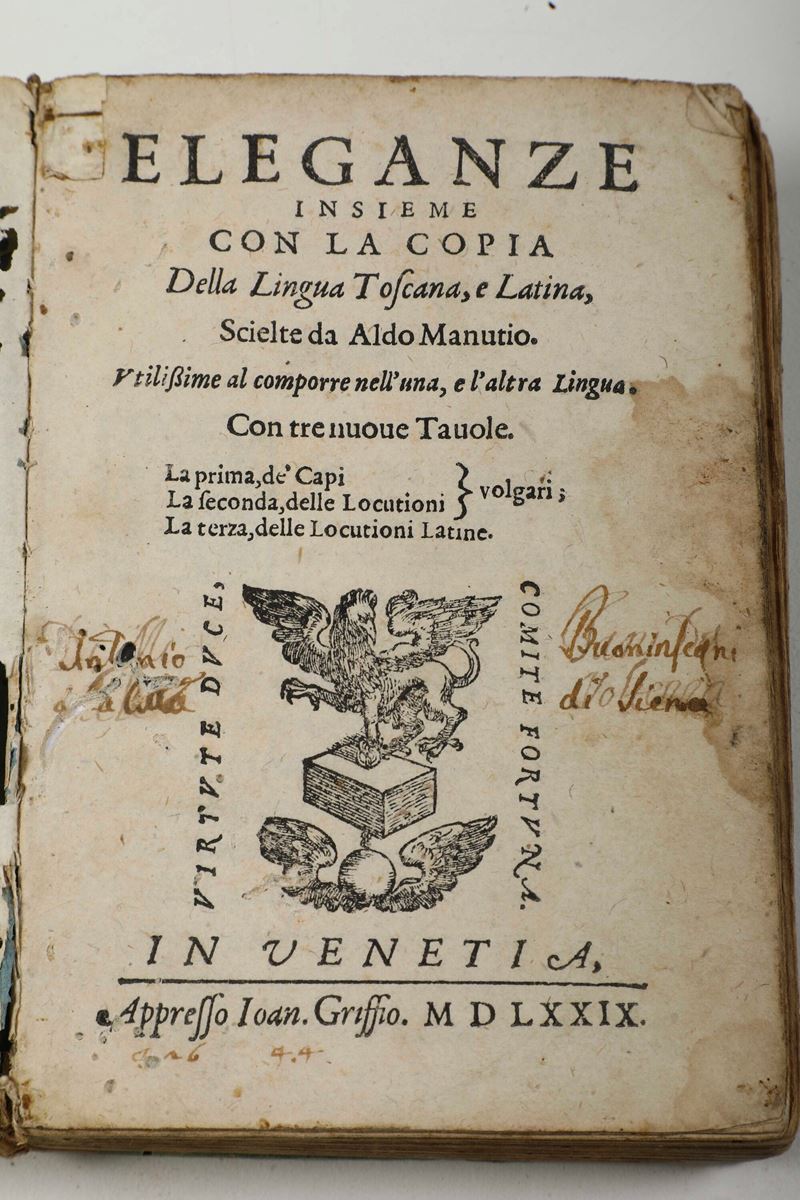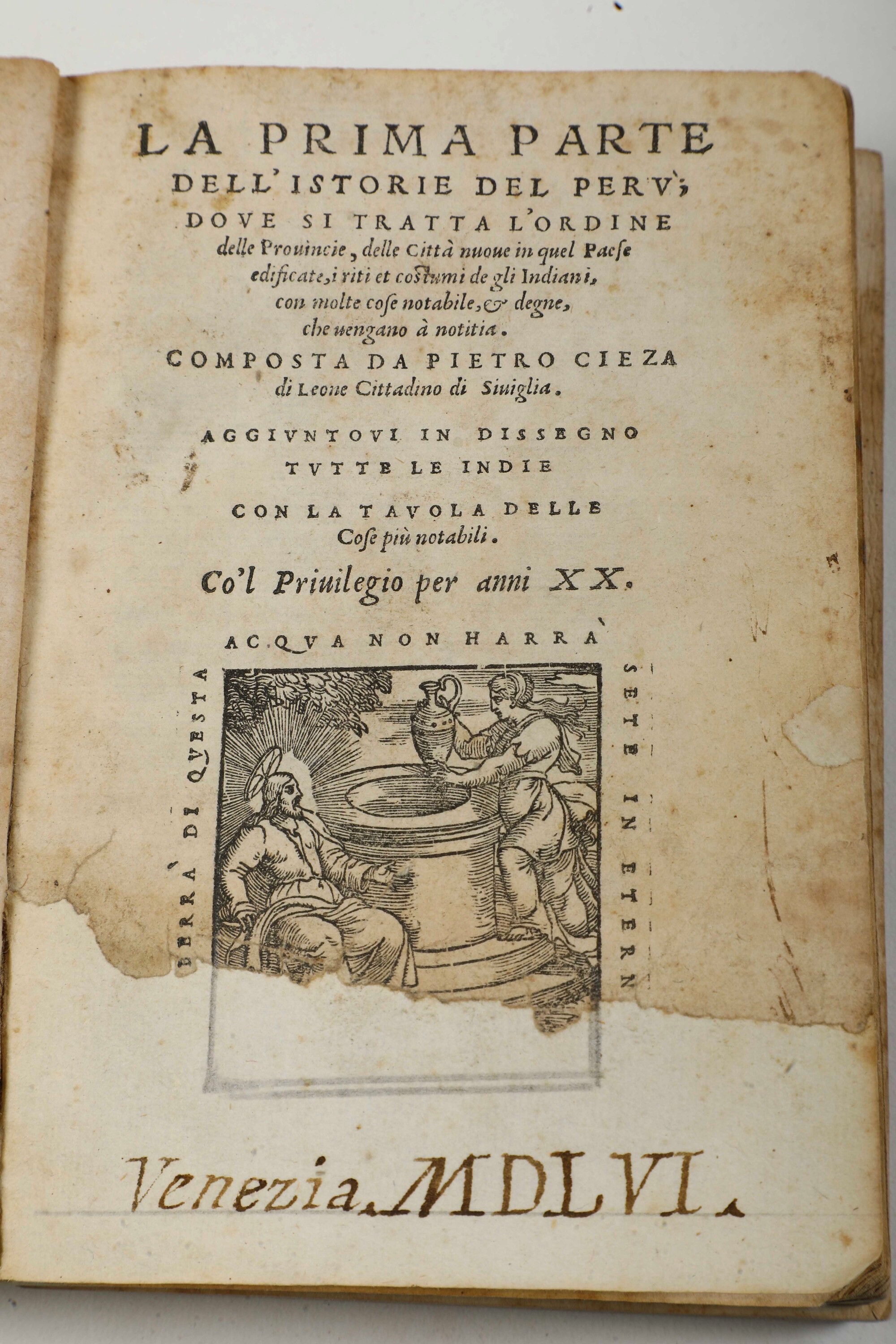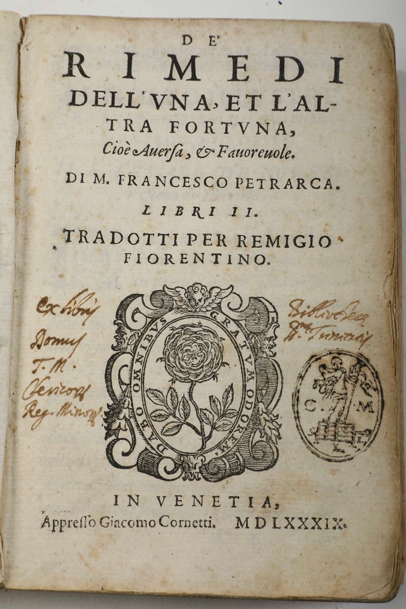 In-4°. Rilegatura coeva in pergamena rigida. Illustrazioni silografiche. Si aggiungono nel lotto: Aldo Manuzio, Eleganze, insieme con la copia della lingua toscana e latina, Venezia, Griffio, 1579; Francesco Petrarca, dei rimedi dell’una e dell’altra fortuna, Firenze, 1589; Pietro Cieza, La prima parte dell’istoria dell’Perù, Venezia, 1556 (mancanza al frontespizio, esemplare parzialmente sciolto)