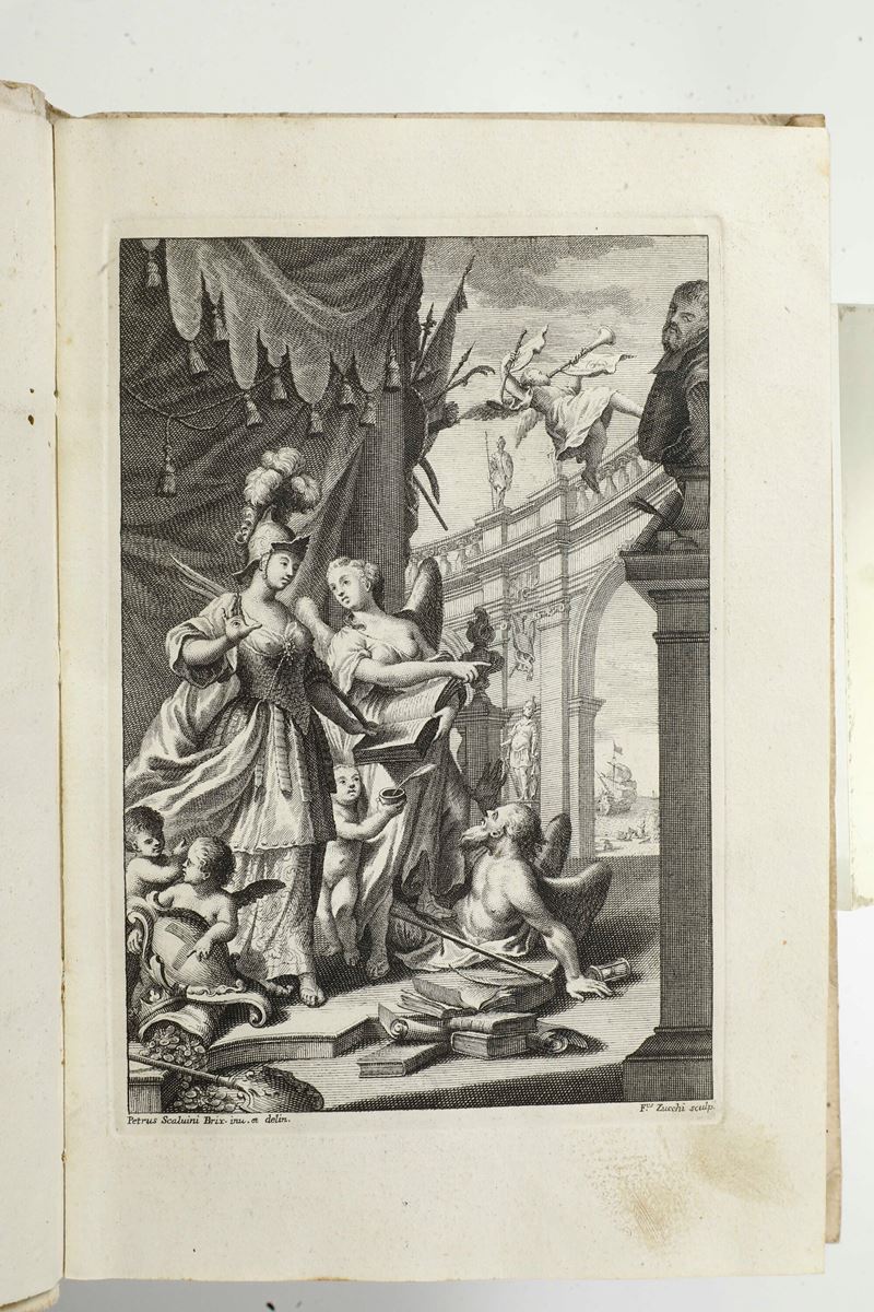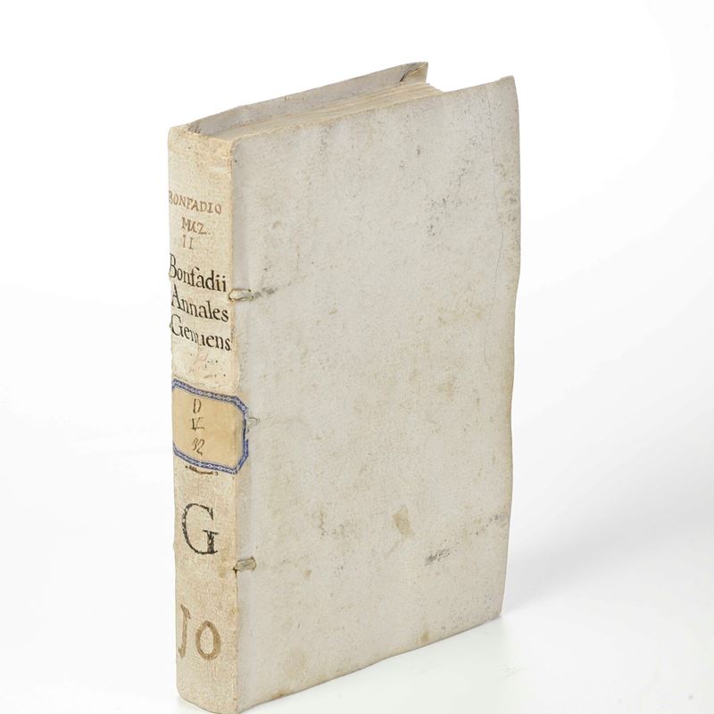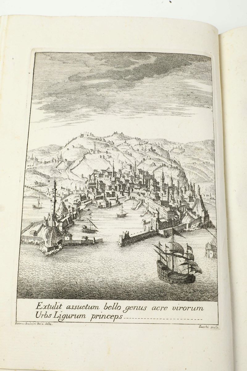 In-4°. Volume II (di due) relativo agli annali; mancano le opere letterarie. Rilegatura in cartonato coevo. Antiporta allegorica incisa, un ritratto del Bonfadio a tutta pagine e una tavola con veduta di Genova. Bell'esemplare fresco e marginoso con poche macchie ed ex libris manoscritto al frontespizio.