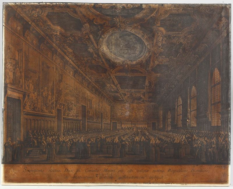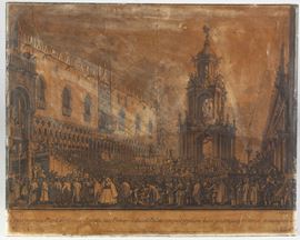 Cm 44 x 55. Su incarico dell'editore e stampatore Lodovico Furlanetto, Canaletto fece dodici disegni dedicati alle feste tradizionali veneziane...Da questi, il Brustolon incise dodici magnifiche vedute.