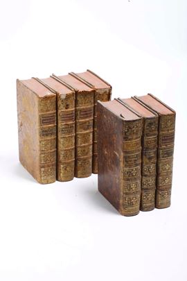 Cinque + due voll. in 4°. (mm 195x121). Rilegature coeva in piena pelle marezzata, tagli rossi (usure, piccole rotture e mancanze, rilegatura dei Supplement lievemente più scura). Bell'esemplare fresco, con alcune gallerie di tarlo concentrate soprattutto nel tomo II "Belle-lettres", bruniture al tomo II dei Supplement.