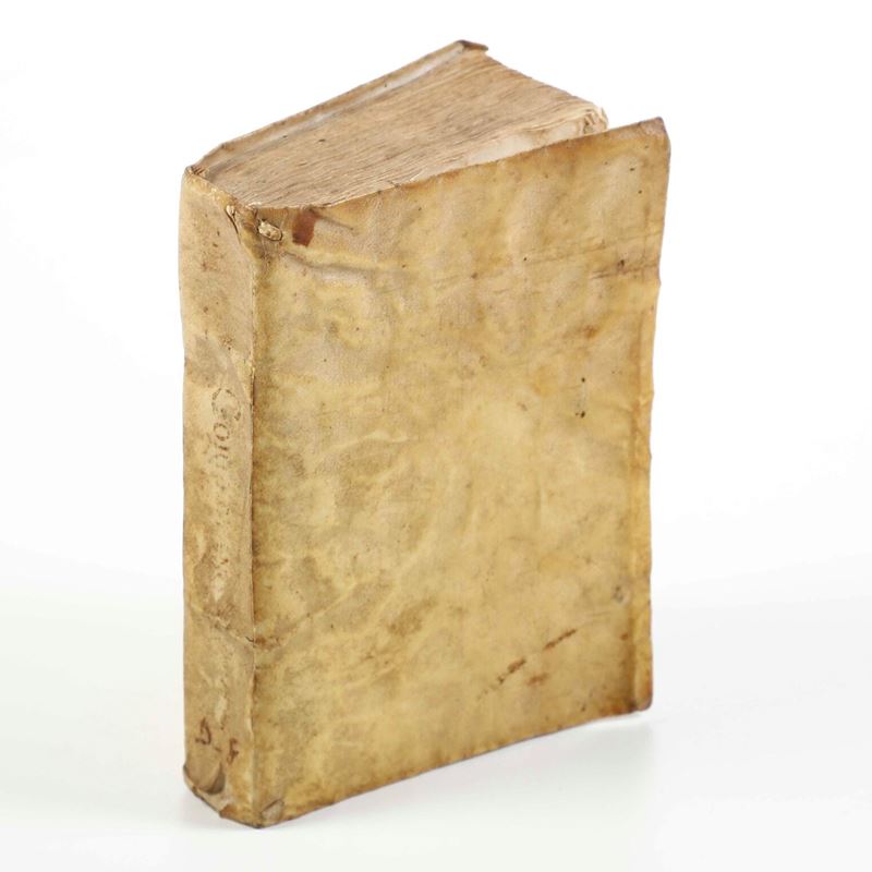 In-8°. Rilegatura coeva in pergamena floscia. Buon esemplare genuino, tuttavia non esente da alcune bruniture e gore. Alla seconda carta mancanza di porzione di carta al piede per probabile asportazione di ex libris manoscritto