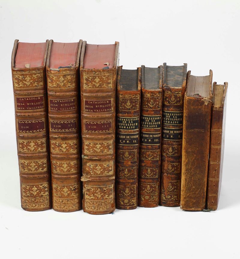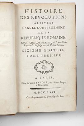 - Abbée de Vertot, Revolutions de la Republique Romaine. A Paris, chez la Veu Savoye, 1767. Tre voll. in-8°. Rilegature coeve in piena pelle marezzata, tagli marmorizzati (usure e piccole mancanze). Esemplare fresco e marginoso;