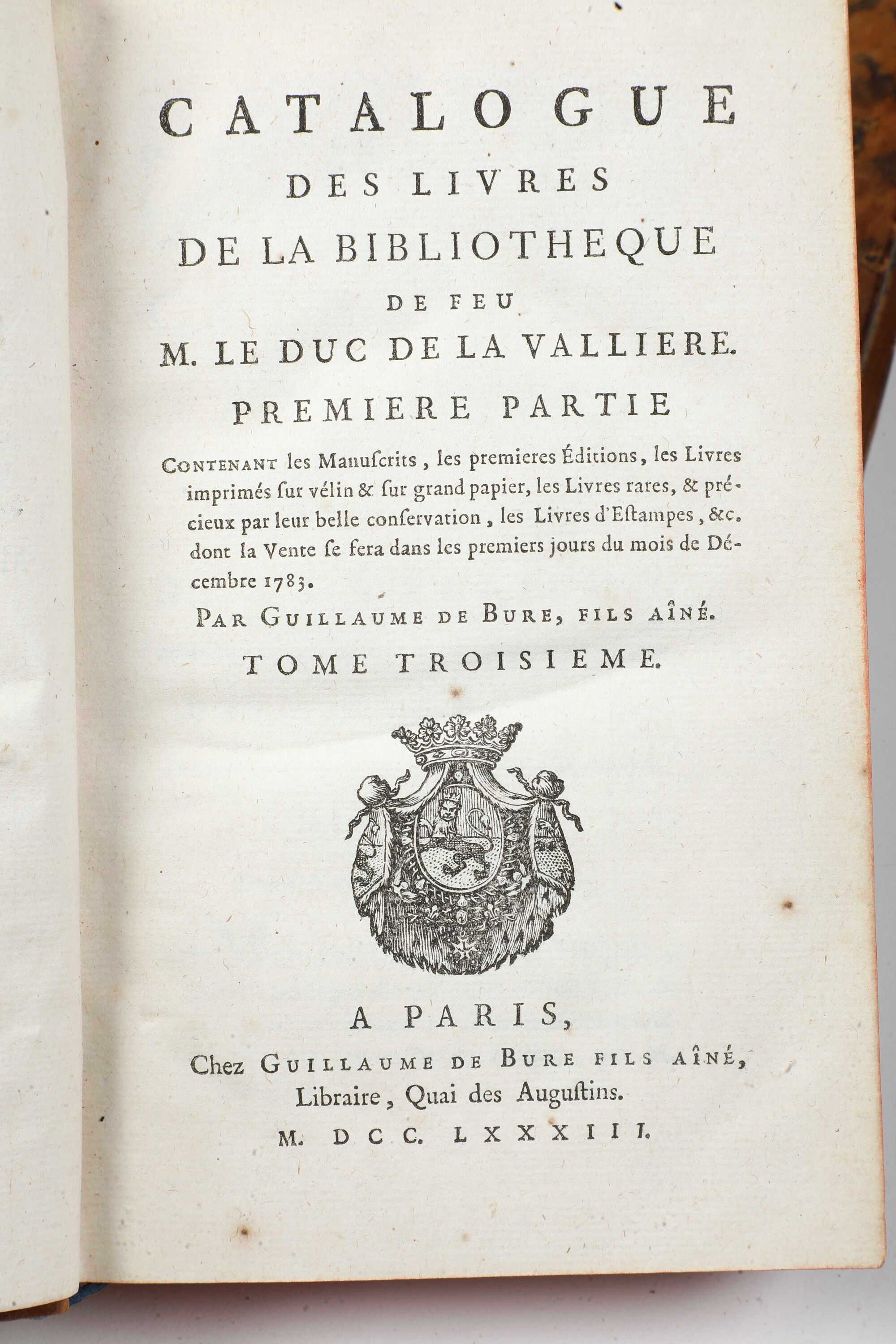 Catalogue des livres de la Bibliotheque de feu M. Le Duc de la Valliere A Paris, chez Guillaume de Bure fils ainé, 1783