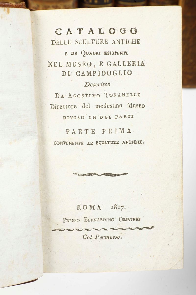 - Catalogo delle sculture antiche e de quadri esistenti nel Museo, e Galleria di Campidoglio. Roma, presso Bernardino OPlivieri, 1817. In-8°. Rilegatura coeva in piena pelle, tagli dorati. (usure e qualche abrasione). Esemplare fresco;