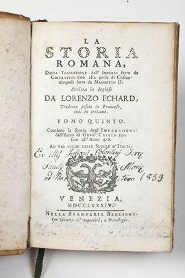 - Lorenzo Echard, La storia romana. Venezia, nella stamperia Baglioni, 1784. Scompleto, presente solo il tomo V. In-8°. Rilegatura coeva in pergamena rigida (piccole mancanze). Foxing, bruniture, macchie e note manoscritte