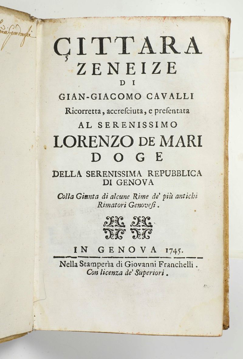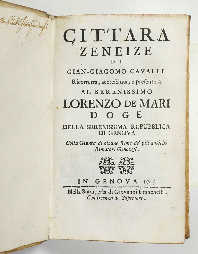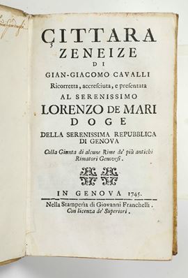 Cavalli Gian Giacomo (1590-1657) Cittara Zeneize.. In Genova, nella stamperia di Giovanni Franchelli, 1745