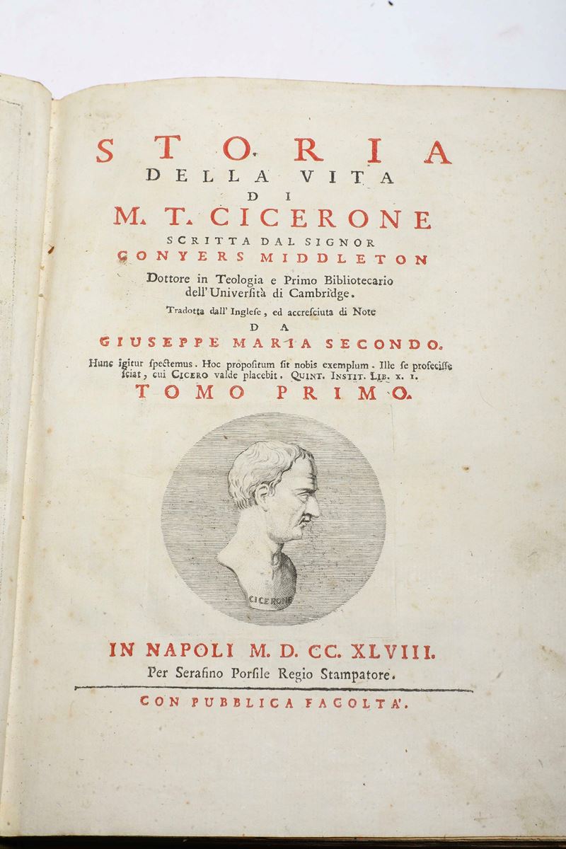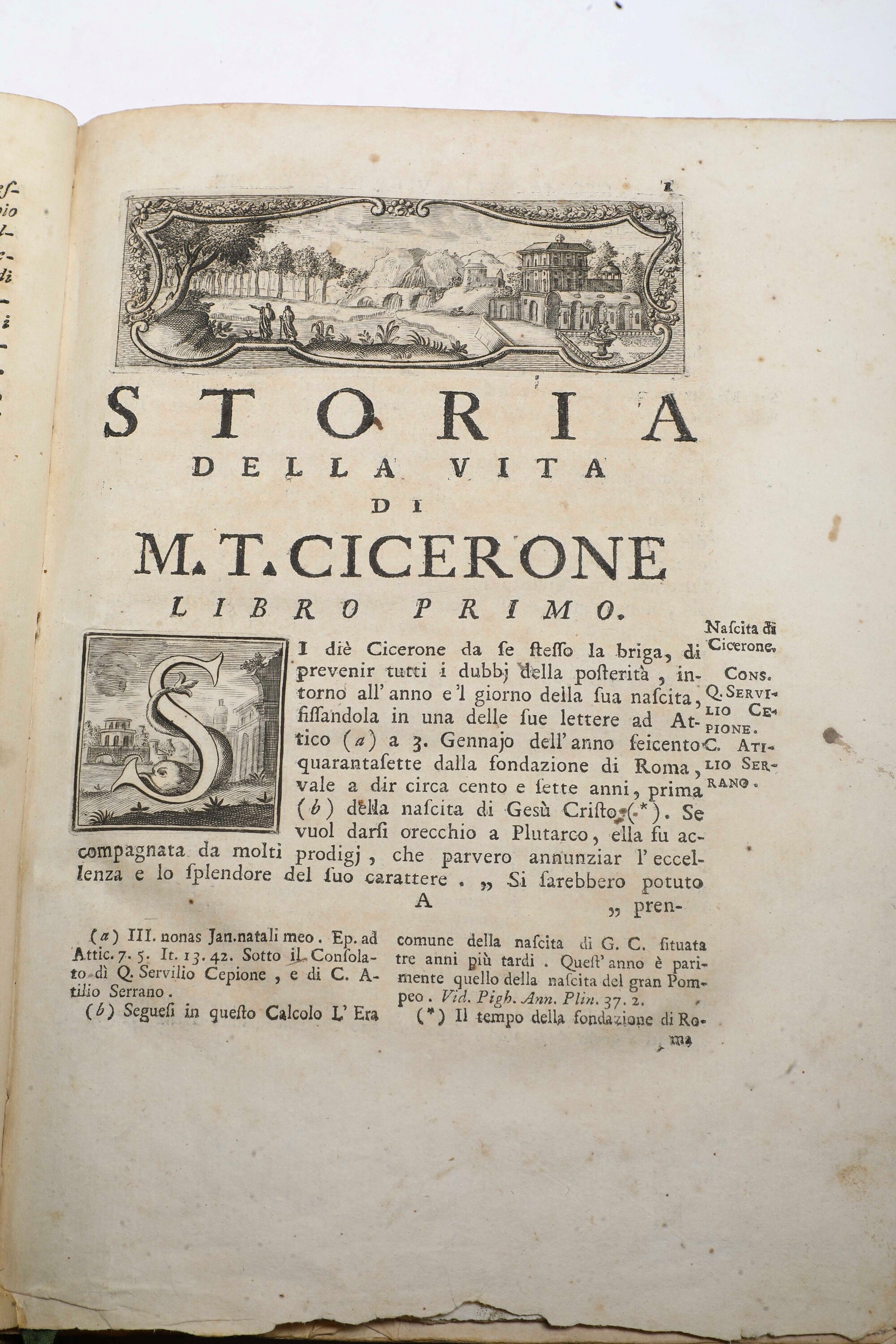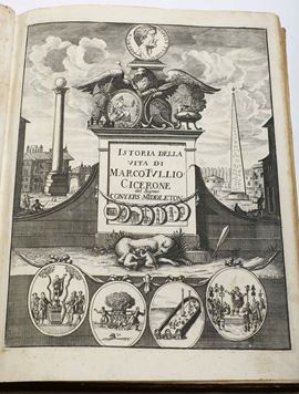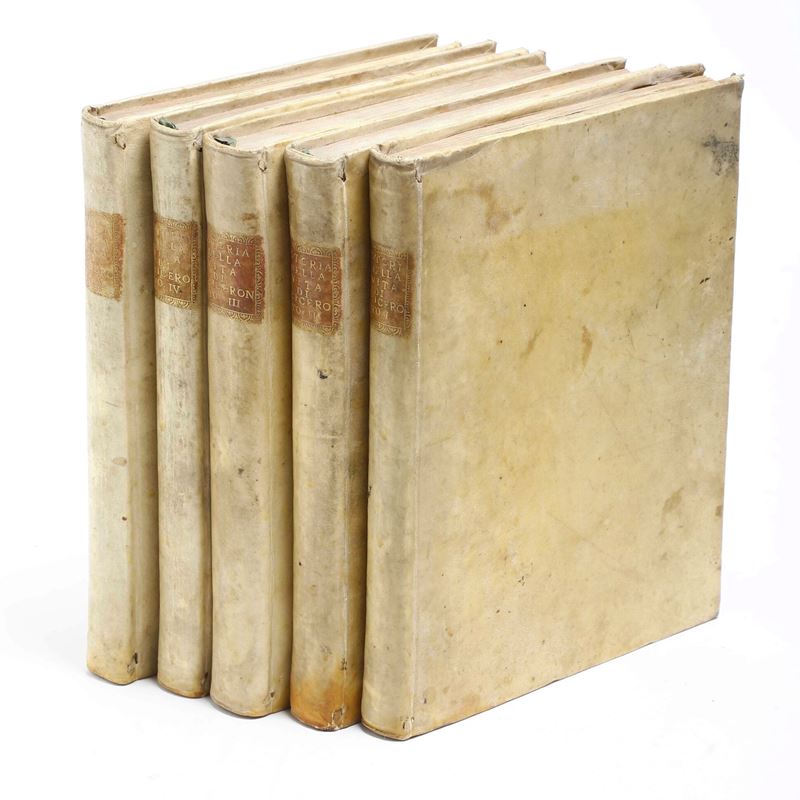 Cinque tomi in-4° (cm 27,3x20). Bell'antiporta incisa al primo tomo con trionfo architettonico che inquadra il titolo dell'opera sormontato da medaglia di Cicerone, profili di Cicerone al frontespizio in nero e rosso, presenti alcune belle incisioni fuori testo raffiguranti, per lo più, monete o ricostruzioni di edifici romani. Legature in piena pergamena rigida con tassello con titolo e numero di tomo. Esemplare in discrete condizioni con buoni margini e foxing.