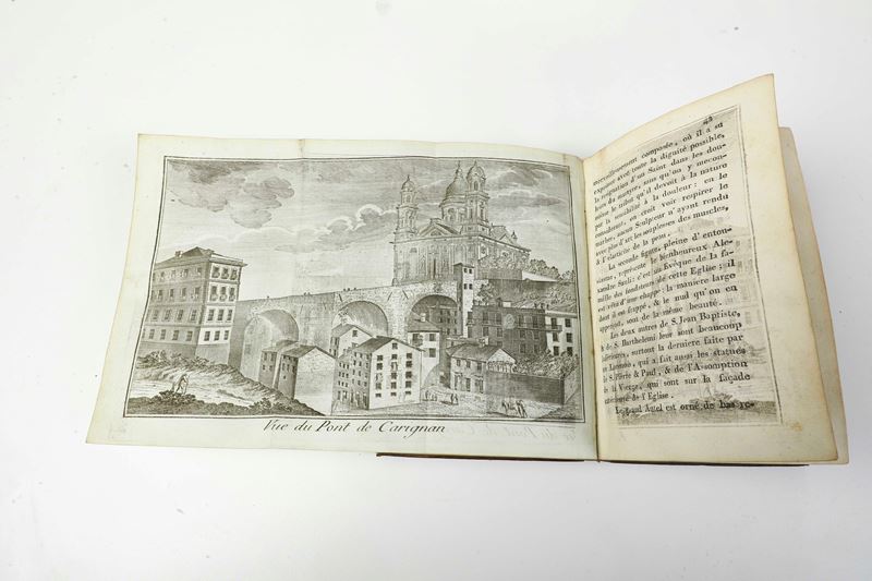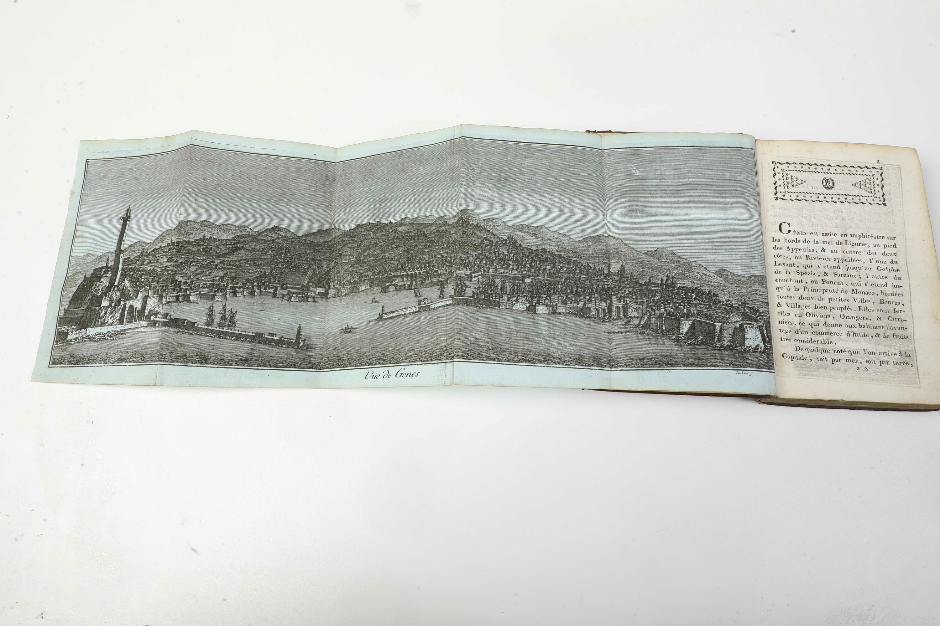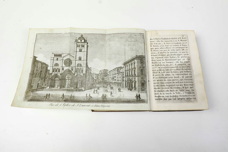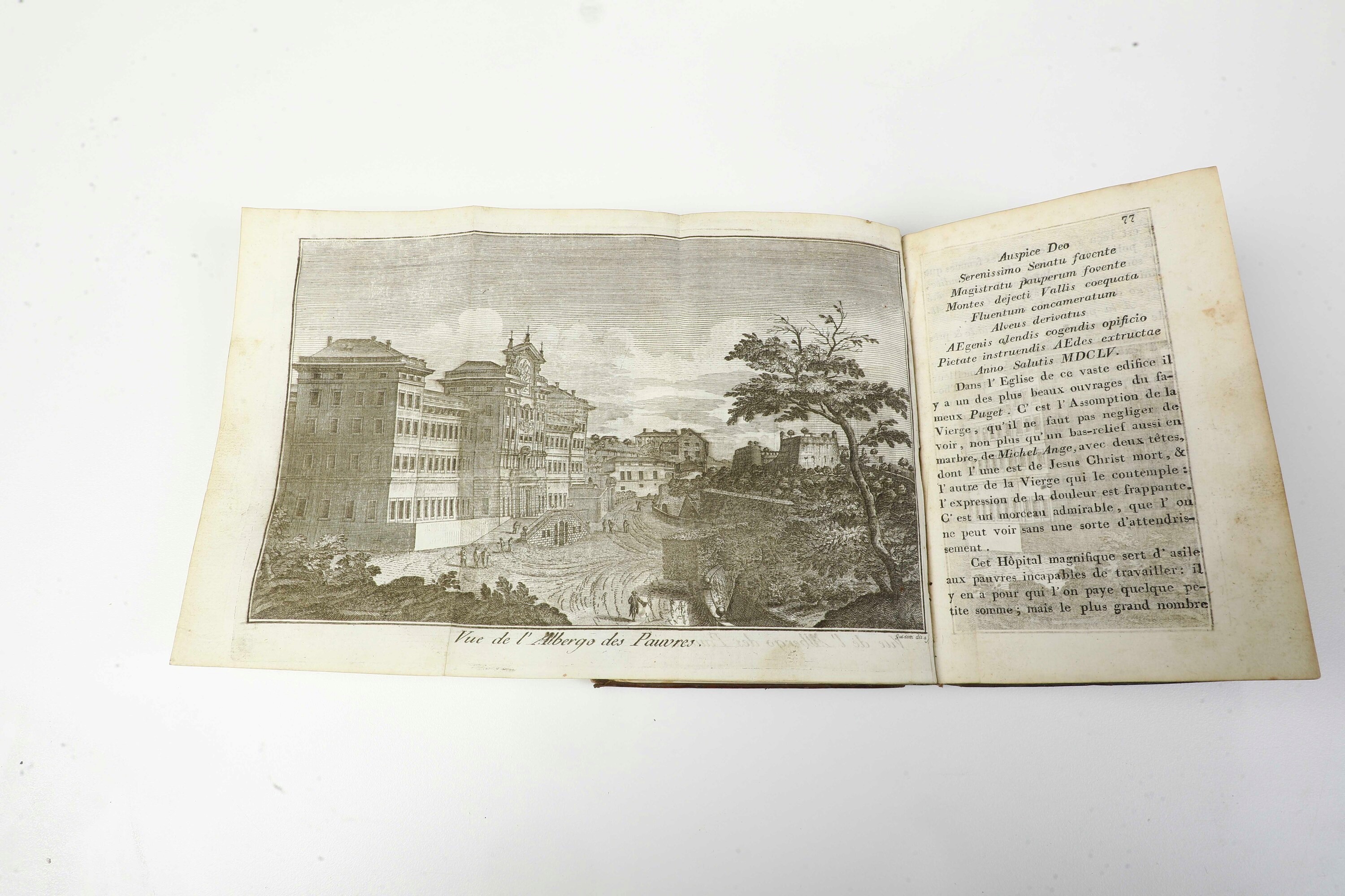 In-8°. Legatura coeva in piena pelle (usure e piccole mancanze). Belle tavole ripiegate con vedute di Genova e di suoi monumenti. Esemplare fresco e con buoni margini, qualche macchia