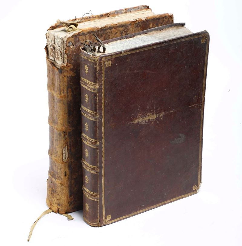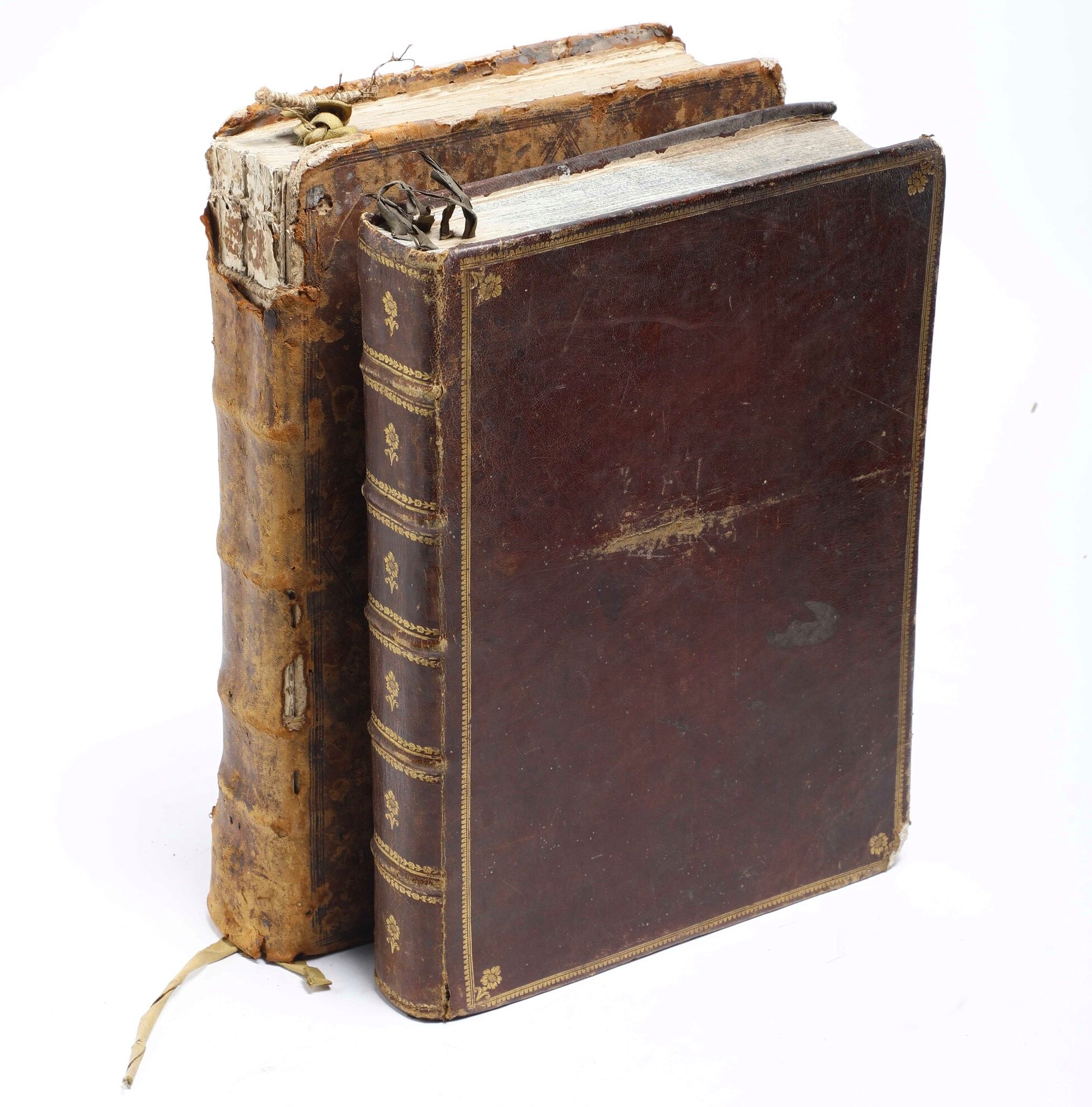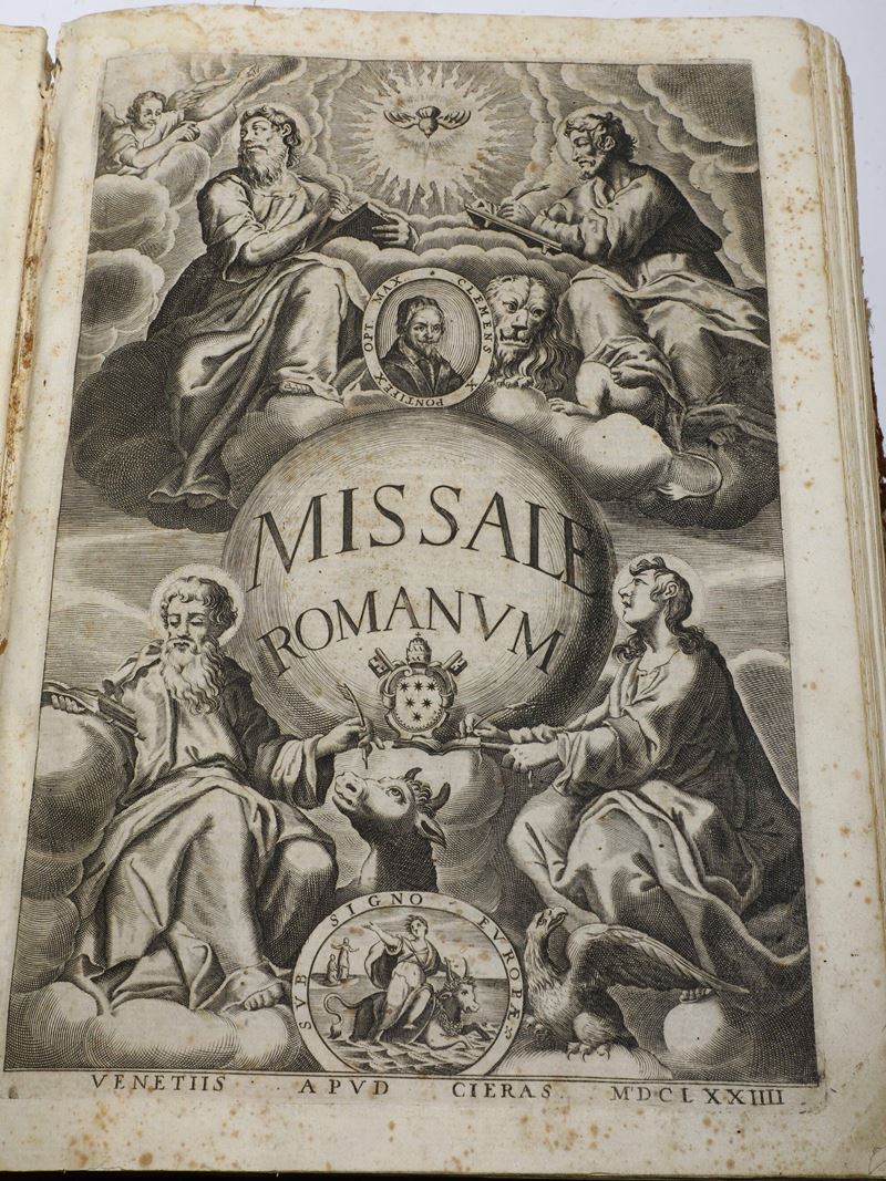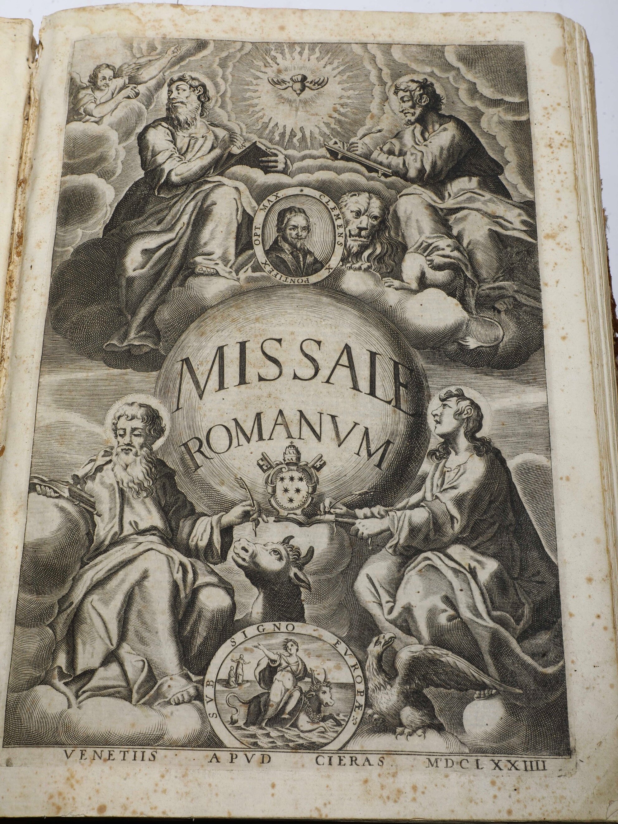 In-folio (cm 34,9x24). Frontespizio riccamente decorato con incisione a tutta pagina raffigurante i quattro evangelisti e papa Clemente X, alcune pregevoli tavole a tutta pagina di soggetto religioso, iniziali e finalini silografici, testo in nero e rosso. Legatura in piena pelle (usure e mancanze).