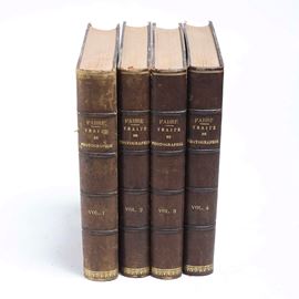 Quattro volumi in-4° (mancanti i quattro supplementi). Legatura ottocentesca in mezza pelle con piatti marmorizzati, autore, titolo e numero di volume impressi in oro al dorso, ex libris nobiliare al contropiatto. Prima edizione dell'importante trattato enciclopedico sulla tecnica fotografica, allora pionieristica, redatto da un professore della facoltà di scienze di Tolosa.