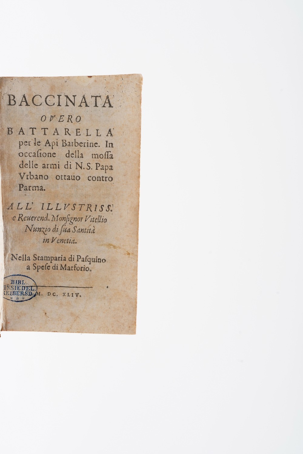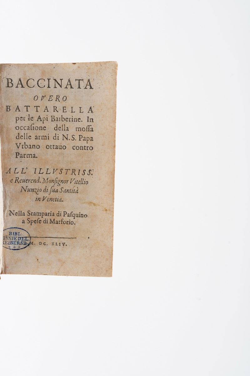 (Ferrante Pallavicino) Baccinata overo Battarella per le api barberine... nella stamperia di Pasquino a spese di Marforio... [..]