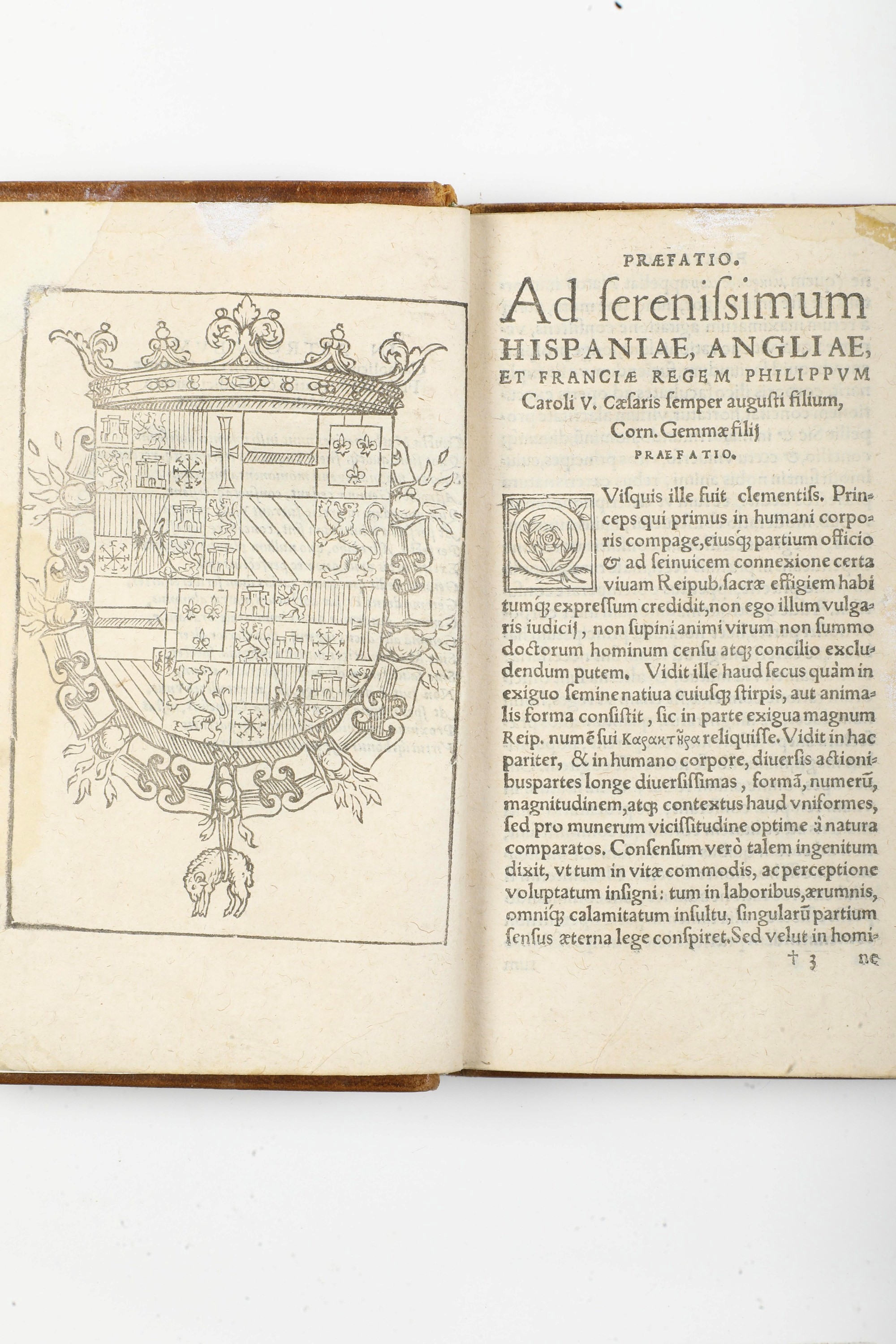 In-8°. (mm 176x104). 16 cc. nn. + 183 cc. num. 1 c. nn. + 1 tav. f.t. ripiegata. Rilegatura del XIX secolo in piena pelle, dorso con ricca decorazione in oro impresso. Bello stemma di Carlo V a tutta pagina in principio d'opera, iniziali silografiche e illustrazioni esplicative, alcune a tutta pagina. Alcuni restauri, per lo più marginali, margine superiore un po' corto.