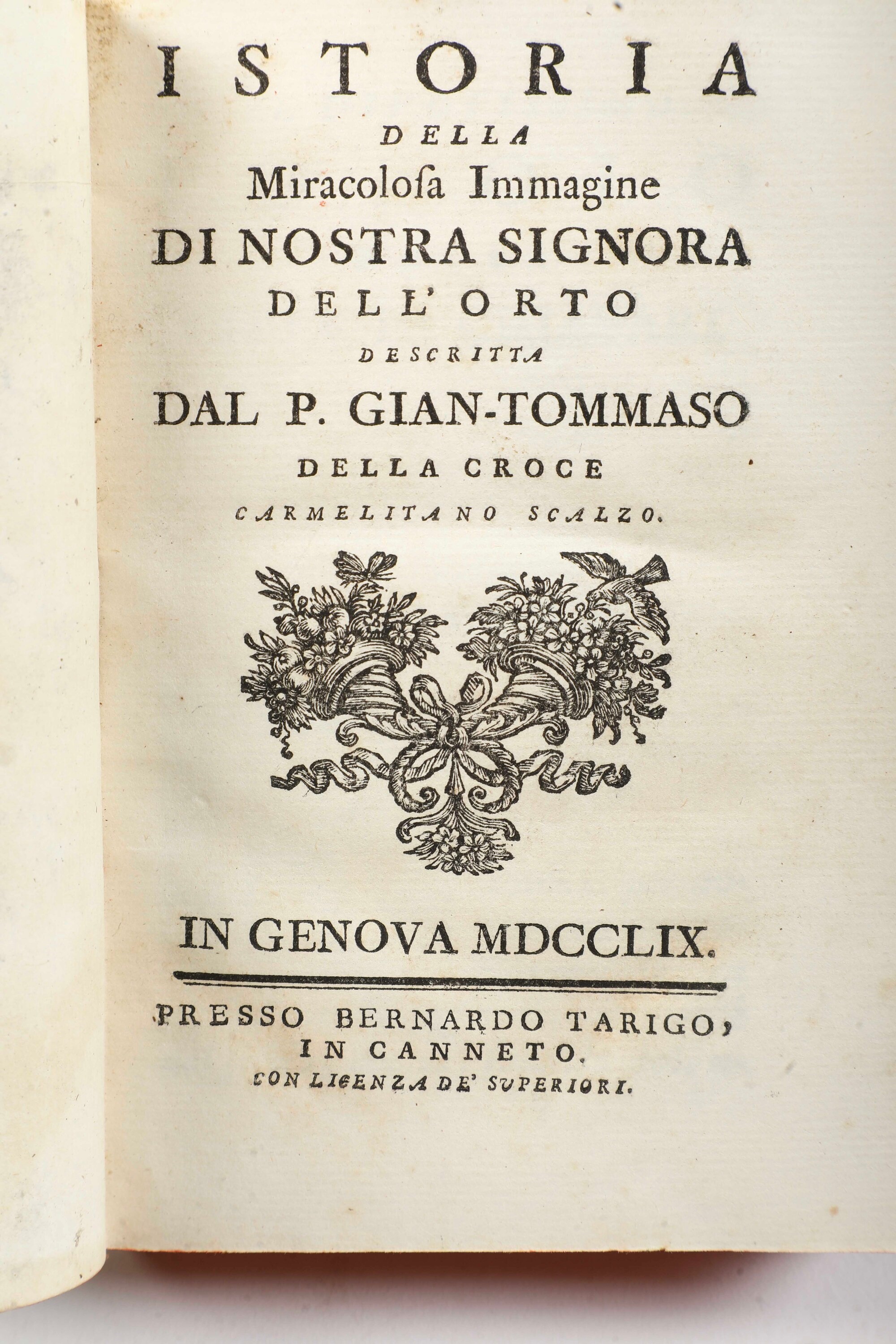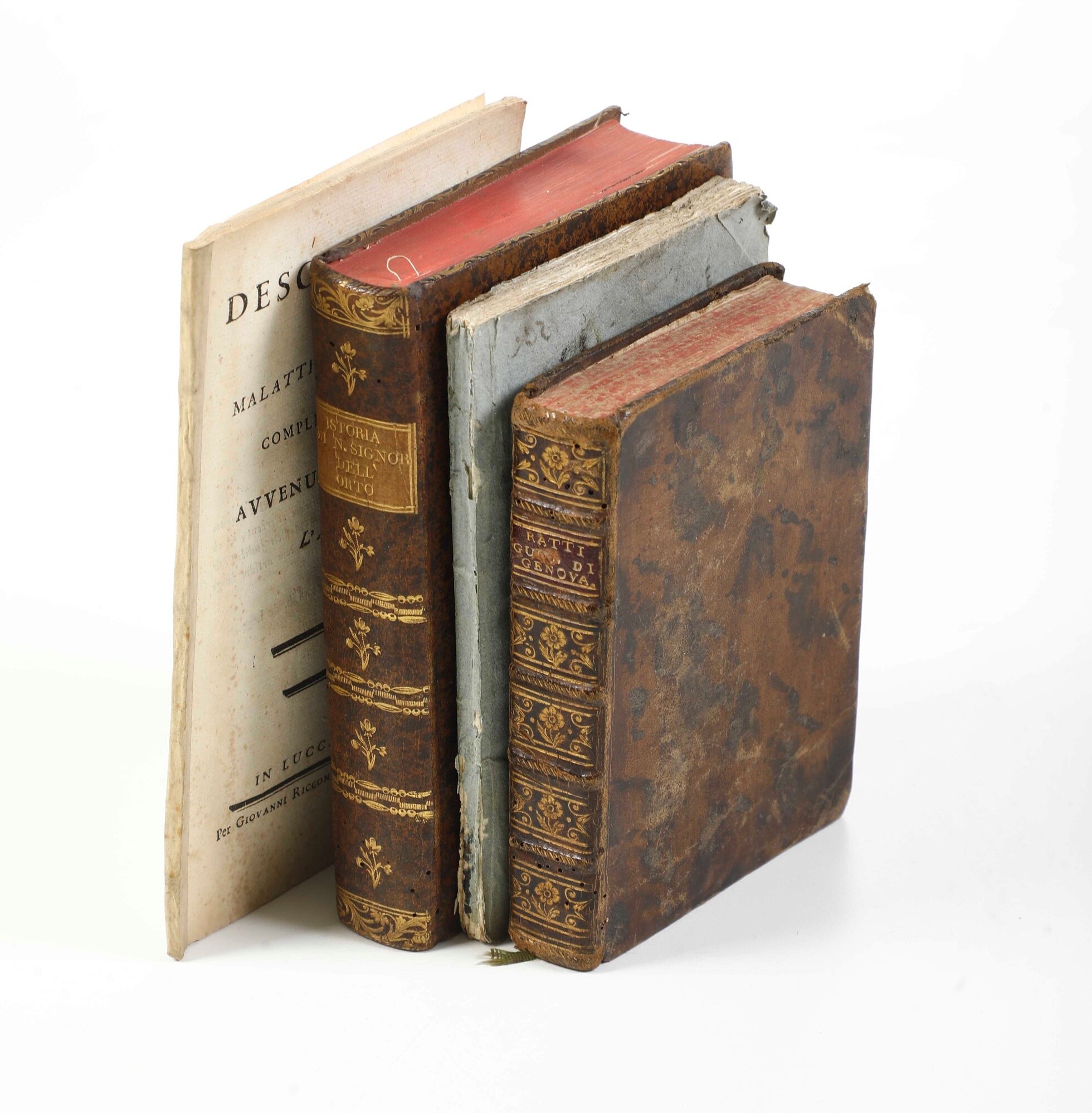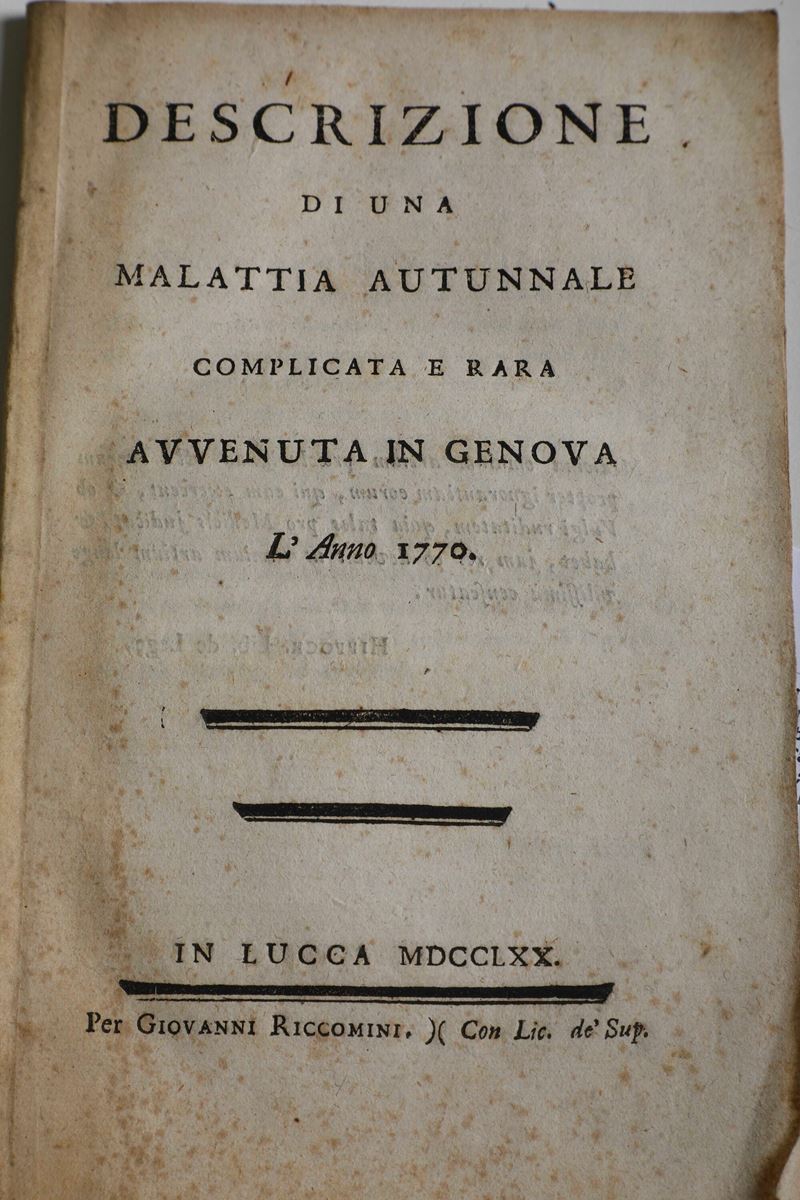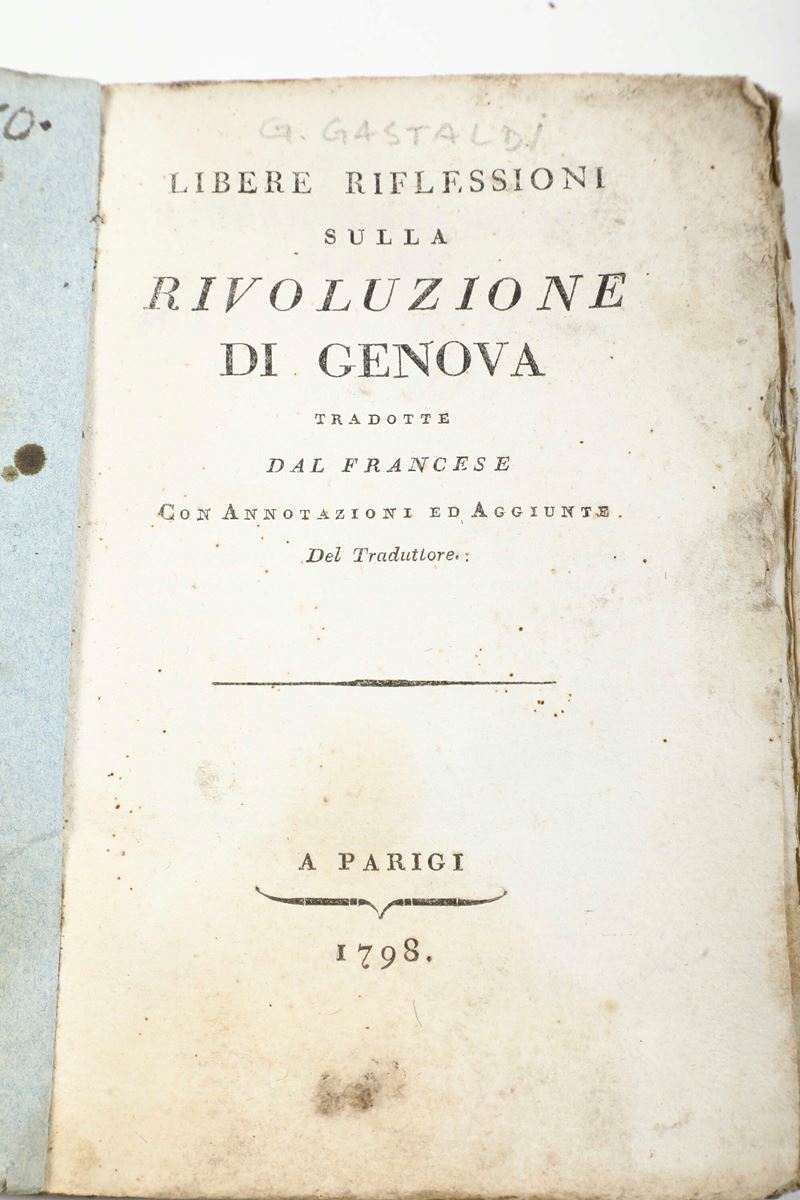 In-8°. Rilegatura coeva in piena pelle, strappi e mancanze. Manca anche la grande carta topografica ripiegata. Si aggiungono nel lotto: (G. Gastaldi), libere riflessioni sulla rivoluzione di Genova, A Parigi, 1798; Padre Gian Tommaso della croce, Istoria della miracolosa immagine di nostra signora dell’orto, in Genova, presso Bernardo Tarigo, 1759, bella rilegatura coeva in piena pelle. Con una tavola ripiegata e inserita fuori testo; descrizione di una malattia autunnale complicata e rara, anno 1770, in Lucca, Riccomini, 1770