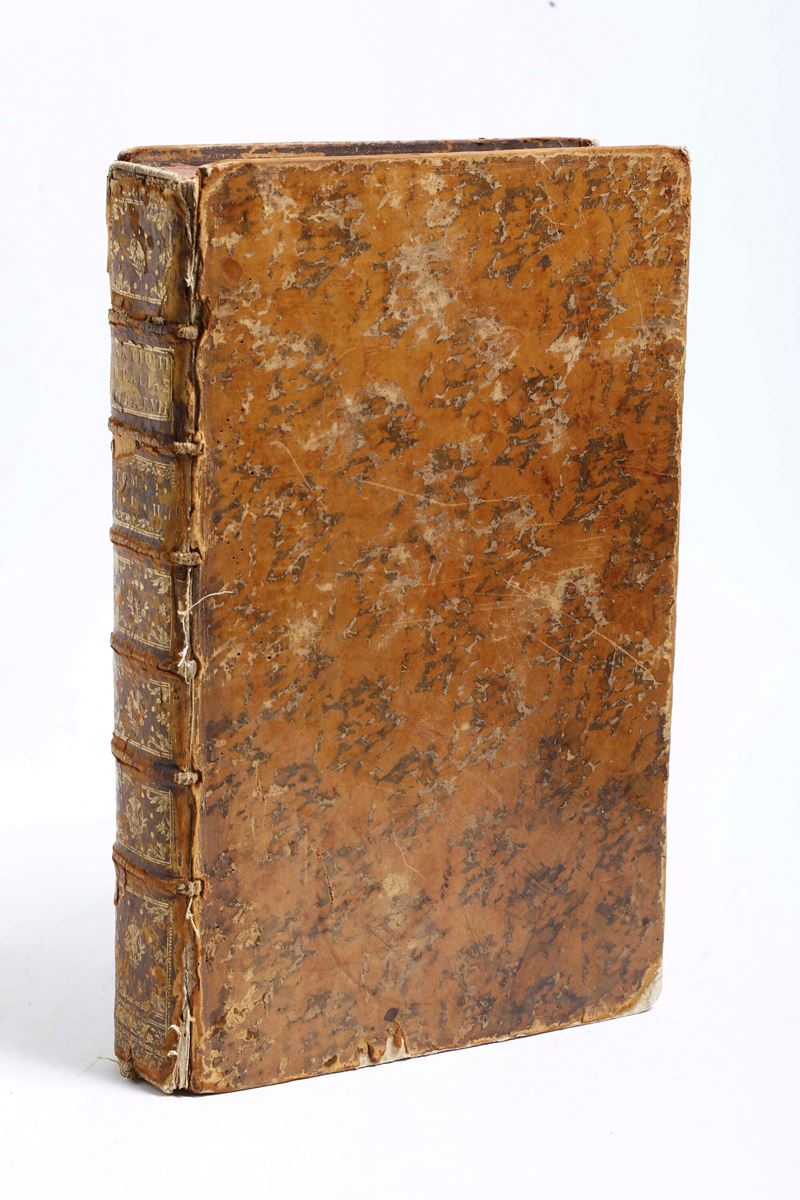 In-folio. Rilegatura coeva in piena pelle che presenta abrasioni e rotture alle cerniere. Ex libris inciso al contropiatto anteriore. Presenti soltanto le due antiporte incise, mancano tutte le tavole