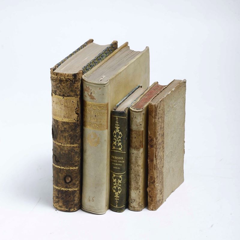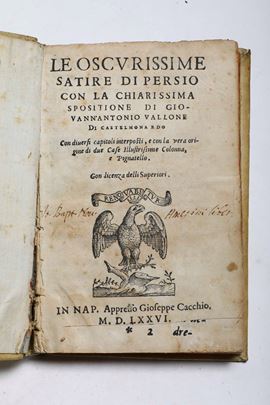 4. Aulo Persio Flacco, Le oscurissime Satire [...] con la chiarissima spositione di Giovann'Antonio Vallone..., Napoli, appresso Gioseppe Cacchio, 1576. In-8°. Legatura in pergamena rigida, al dorso tassello con titolo e autore.