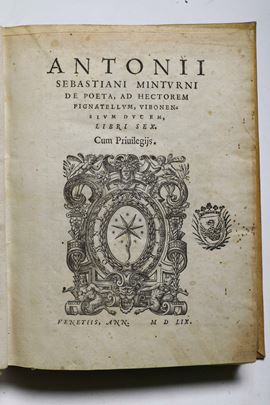 1. Antonio Sebastiani Miturno, De poeta.., Venezia, ad Hectorem Pignatellum, 1559. In-4°. Legatura in pergamena riginda, tassello al dorso con titolo e autore impressi in oro.