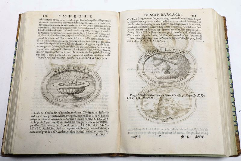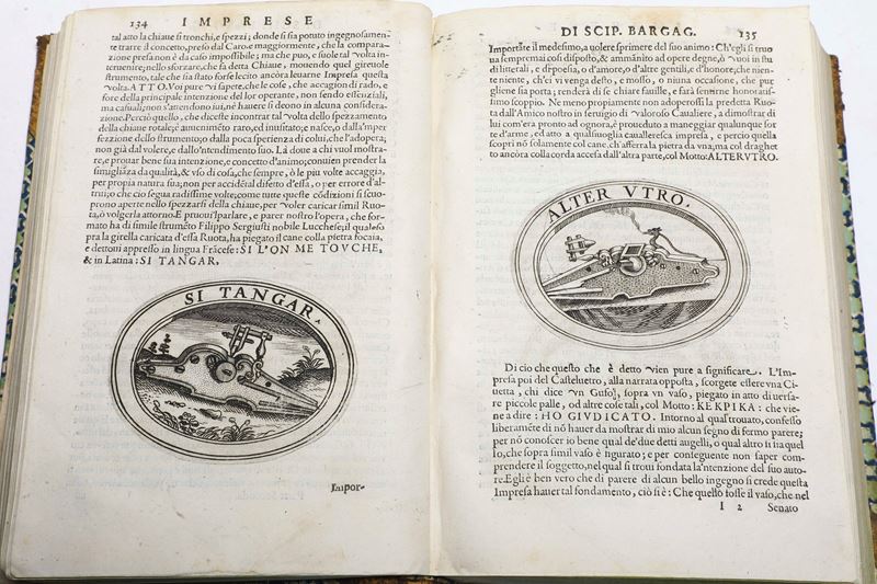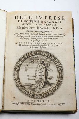 2. Scipione Bargagli, Dell'Imprese.., Venezia, appresso Francesco de Franceschi Senese, 1594. In-4°. Bel ritratto di Rodolfo II e impresa a tutta pagina, altre imprese inserite nel testo. Legatura in mezza pelle e punte, tassello al dorso con titolo e autore.