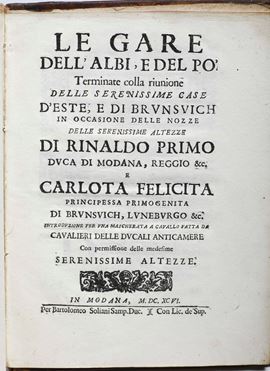 Legatura alle armi di Papa Innocenzo XII Pignatelli Le gare dell'Albi e del Po.. In Modana, per Bartolomeo Soliani Samp.Duc., [..]