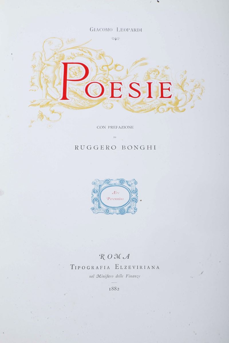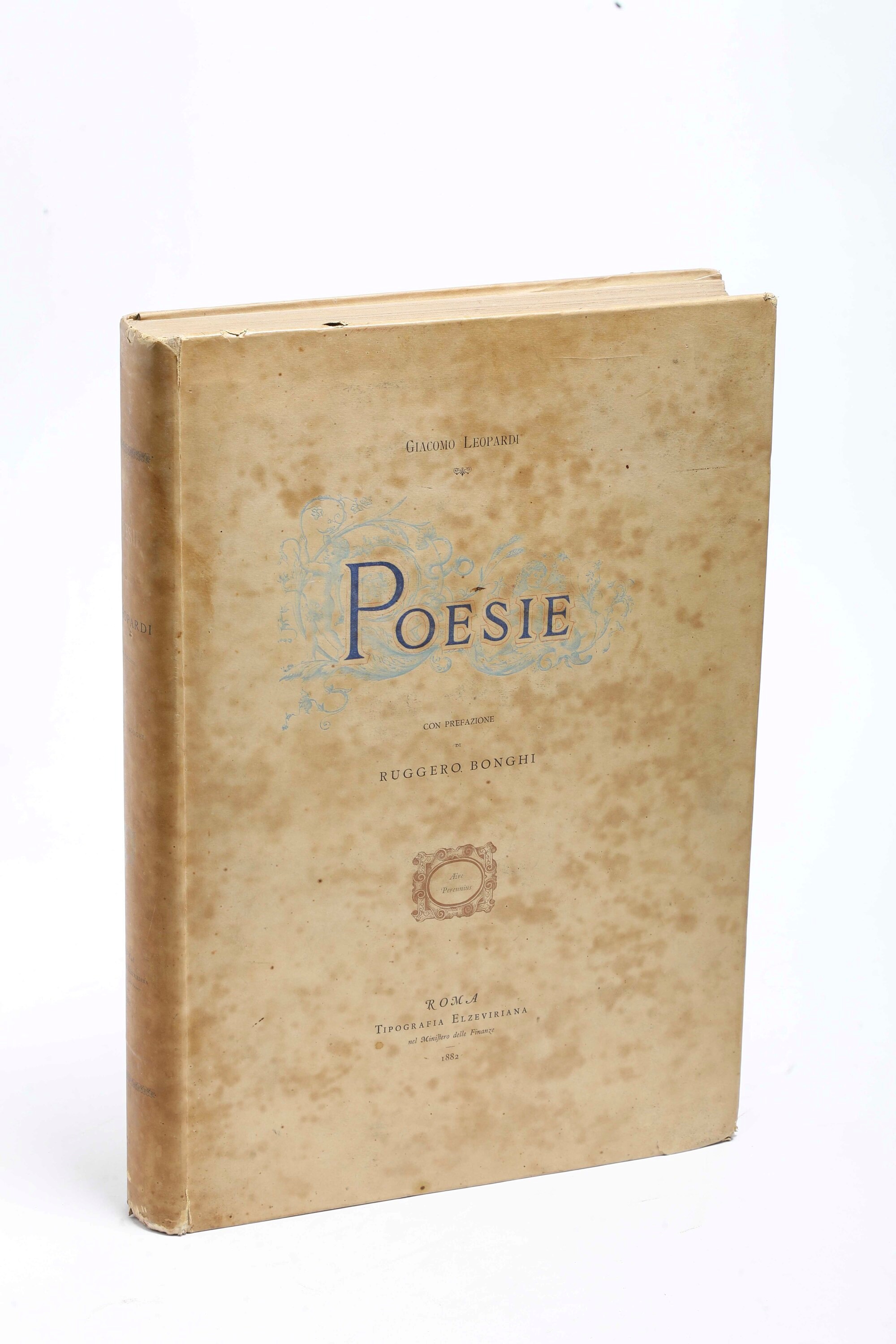 Leopardi Giacomo (1798–1837) Poesie con prefazione di Ruggero Bonghi Roma, Tipografia Elzeviriana nel Ministero delle Finanze, [..]