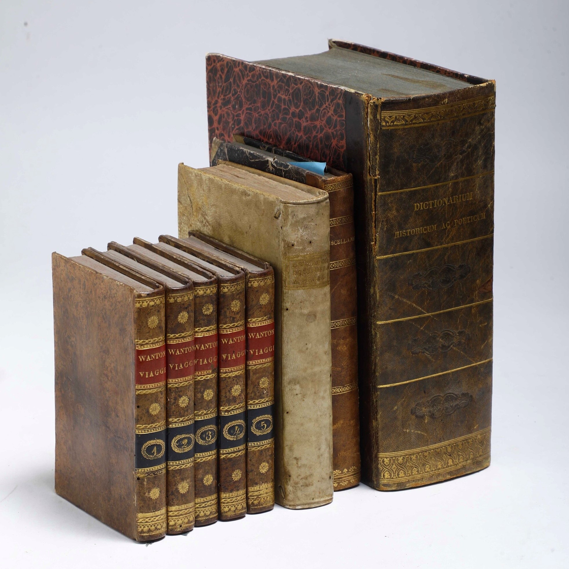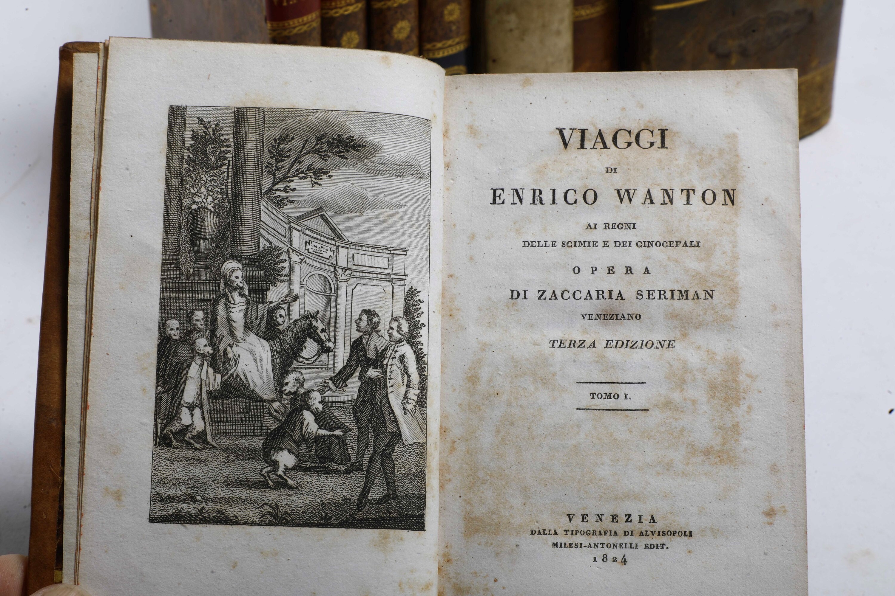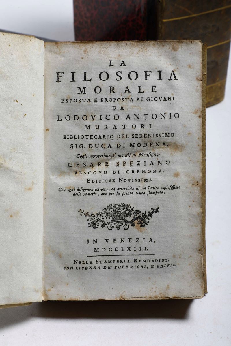 In-4°. Rilegatura in mezza pelle del secolo XIX. Esemplare interfogliato da fogli bianchi predisposti per raccogliere le annotazioni. Si aggiungono nel lotto: raccolta miscellanea di placchette del secolo XVIII; Muratori Ludovico Antonio, La filosofia morale, Venezia, Remondini, 1763; Zaccaria Seriman, Viaggi di Enrico Wanton, Venezia, 1824 - 1826. (5 tomi)