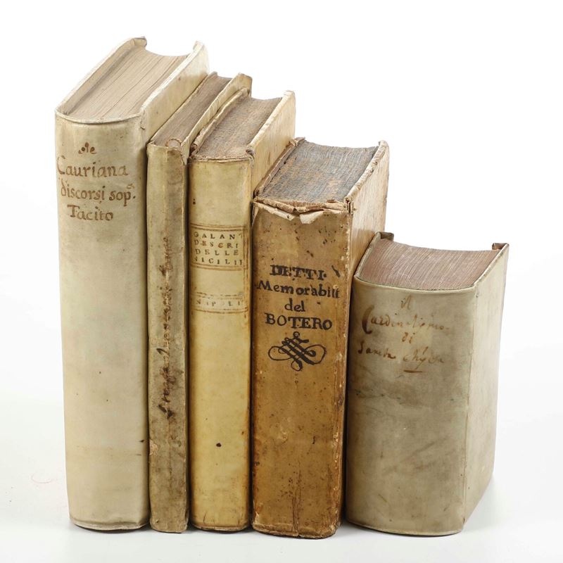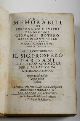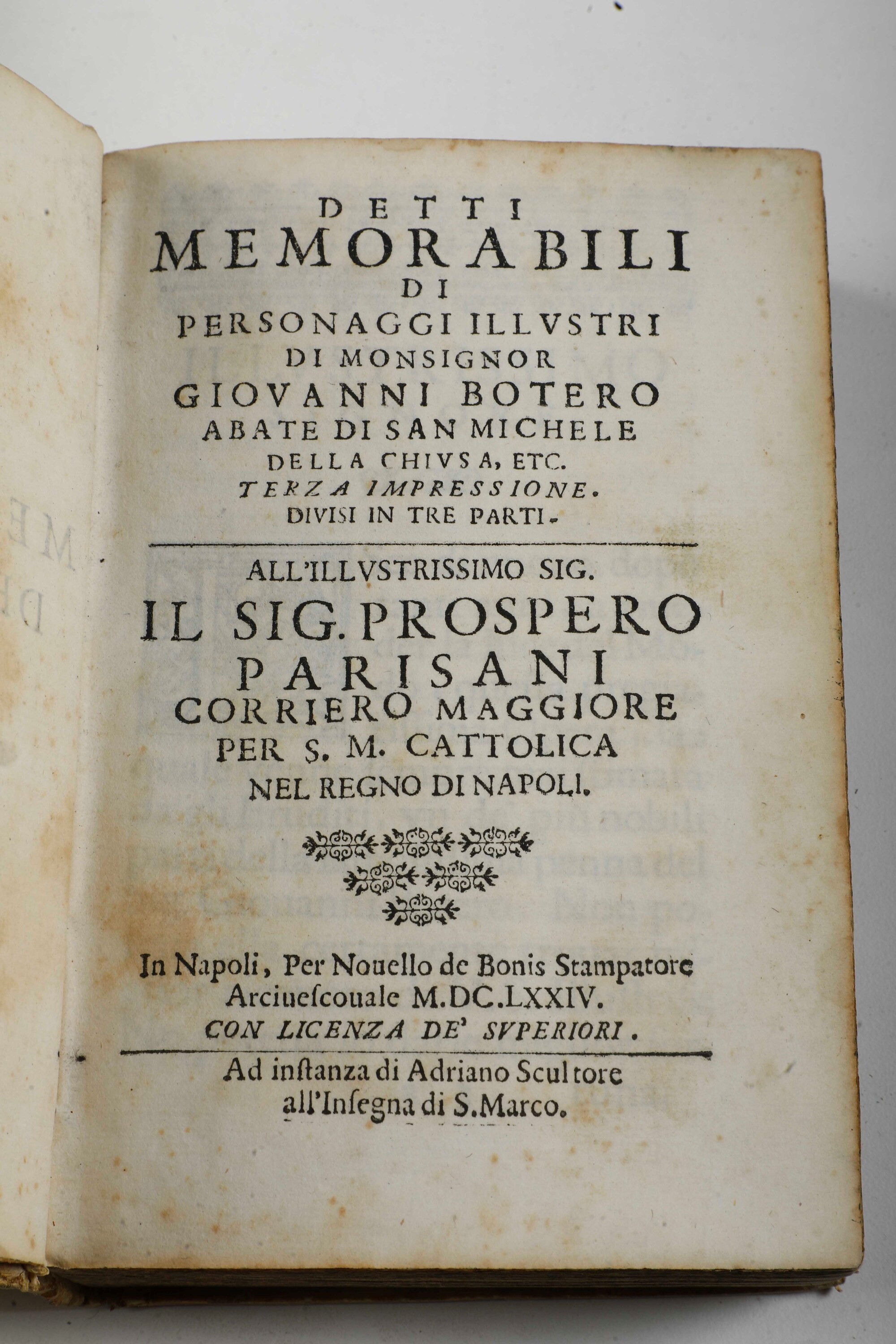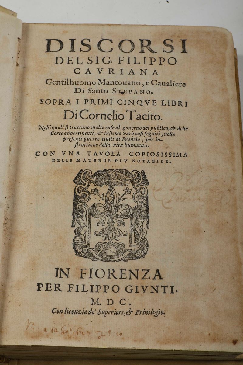 In-4°. Rilegatura antica in pergamena. Alcune bruniture ma esemplare genuino. Si aggiungono nel lotto: Anonimo - Il cardinalismo di Santa Chiesa (diviso in tre parti), 1668; Botero Giovanni, detti memorabili di personaggi illustri, Napoli, per Novello De Bonis, 1674; Anonimo - breve descrizione di Napoli e del suo contorno, Napoli, 1792 (esemplare senza tavole); Cavriana Filippo, Discorsi sopra i primi 5 libri di Cornelio Tacito, Firenze, Giunti, 1600.