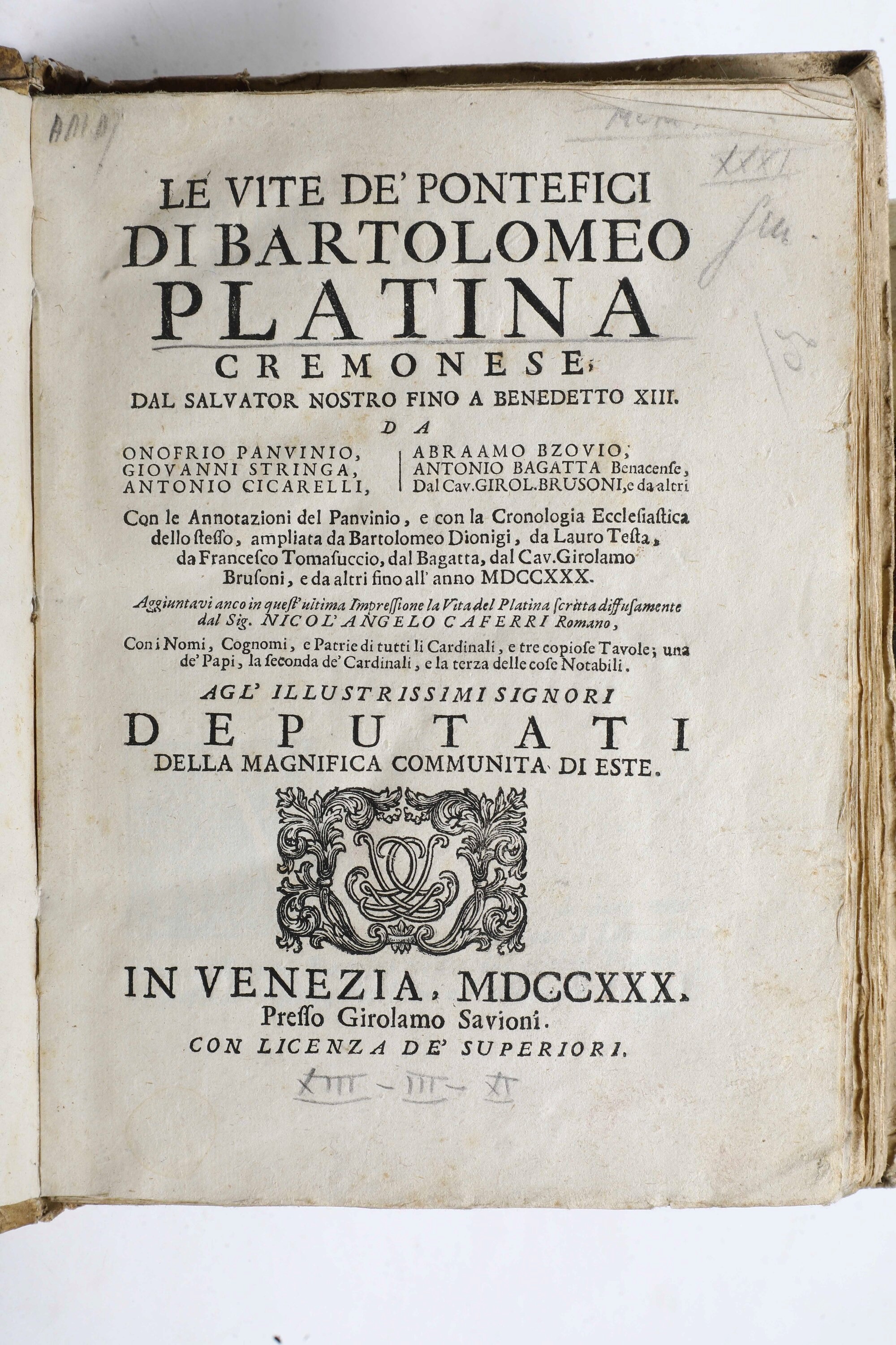 - Platina Bartolomeo e altri, Le vite de' Pontefici. In Venezia, presso Girolamo Savioni, 1730. In-4°. Rilegature in cartonato rustico (usure e mancanze). Bei ritratti silografici dei Papi nel testo. Esemplare fresco