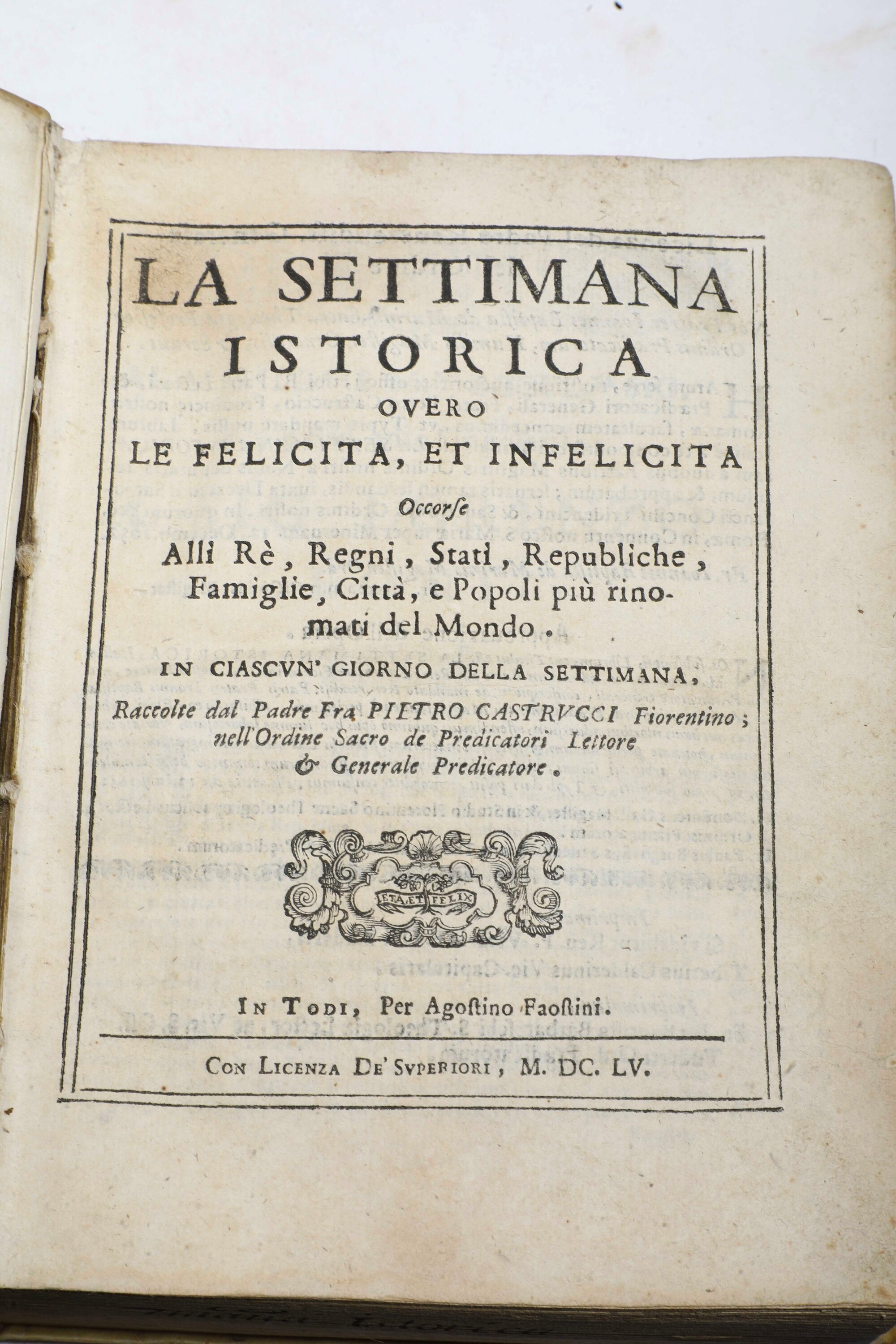 - Castrucci Pietro, La settimana istorica overo la felicita, et infelicita. In Todi, per Agostino Faostini, 1655. In-4°. Rilegatura del XVII-XVIII secolo in pergamena floscia (qualche macchia, parzialmente distaccata). Bruniture;