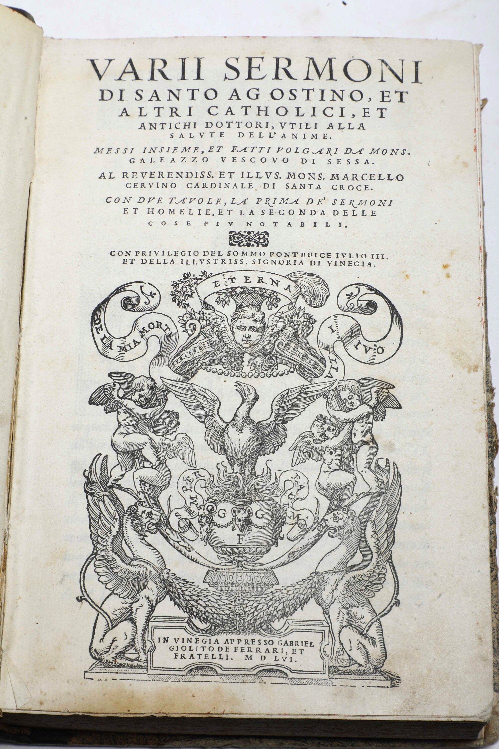 - Varii Sermoni di Santo Agostino, et altri catholici..In Vinegia, appresso Gabriel Giolito de Ferrari, et fratelli, 1556. In-4°. Rilegature del secolo XIX in mezza pelle (tracce di umidità, usure). Esemplare fresco ma con margini corti, poche macchie e gore alle ultime carte;