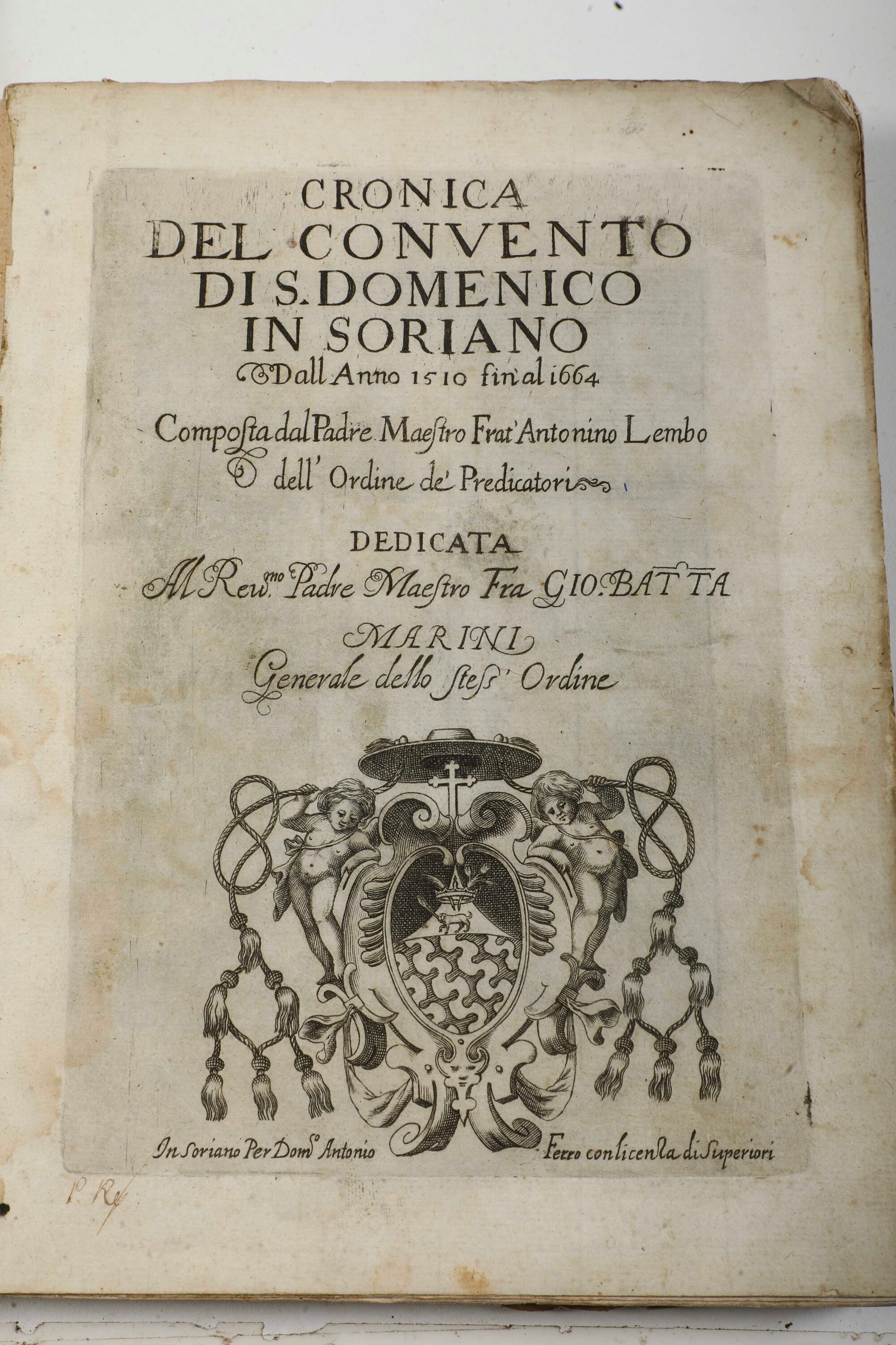 - Lambo Antonino, Cronica del convento di San Domenico di Soriano...In Soriano, per Domenico Antonio Ferro, 1665 (restauti alle prime carte e fori di tarlo, macchie, rotture e mancanze alla rilegatura in cartonato);