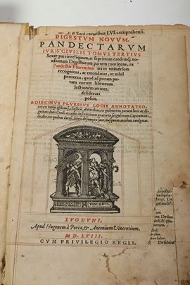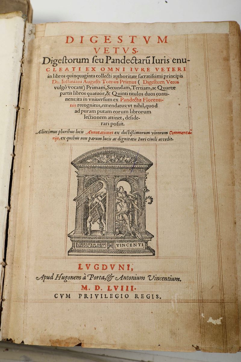 - Digestum vetus...Lugduni, Apud Hugonem à Porta et antonium Vincentium, 1558 (Mancanza alle prime carte e danni da umidità, rotture alla rilegatura)