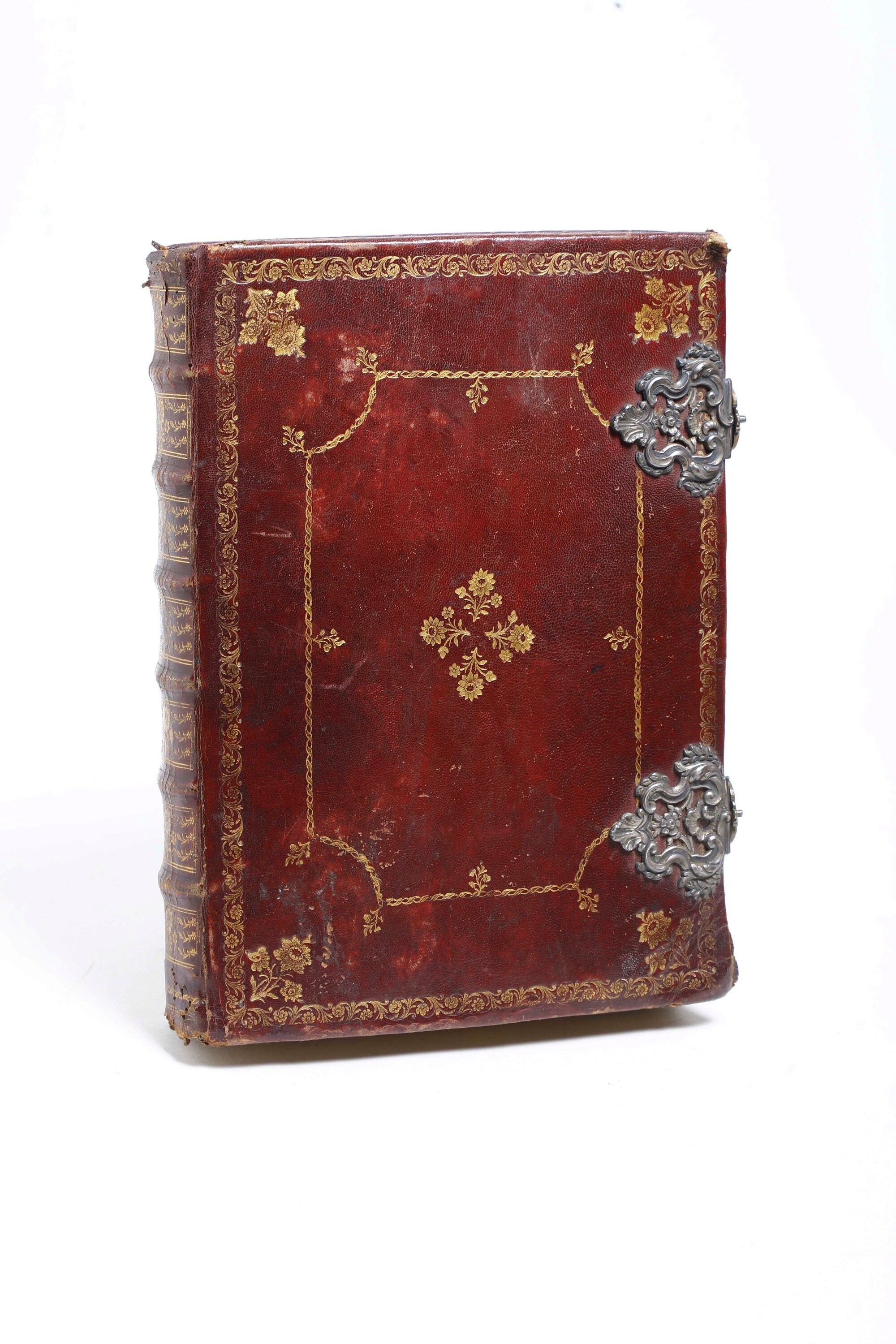 In-folio. Pregevole rilegatura coeva in marocchino rosso con cornice dorata impressa, tagli dorati, segnalibri in seta, fermagli di gusto rocaille (usure, piccole mancanze, rottura a un fermaglio). Numerose incisioni a tutta pagina a tema religioso, belle iniziali silografiche, testo in nero e rosso su due colonne. Esemplare fresco, con qualche macchia, un po' corto di margini. Legati insieme al termine altri testi religiosi dal XVIII al XX secolo