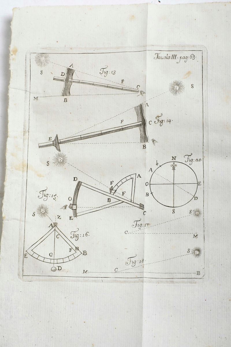 In-4°. Rilegatura coeva in cartoncino alla rustica con rinforzo al dorso. Esemplare genuino e in barbe, tuttavia non esente da alcune lievi gore e fioriture. Sei tavole fuori testo ripiegate.