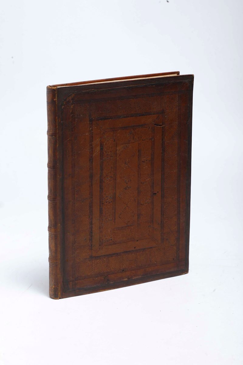 In-4°. Rilegatura in stile monastico del secolo XX che conserva i due piatti originali applicati, due ex libris di cui uno nobiliare al contropiatto anteriore (usure). Bella cornice silografica al frontespizio. Alcune gallerie di tarlo con piccola perdita di testo, rare bruniture, qualche gora marginale e poche macchie, ma discreto esemplare