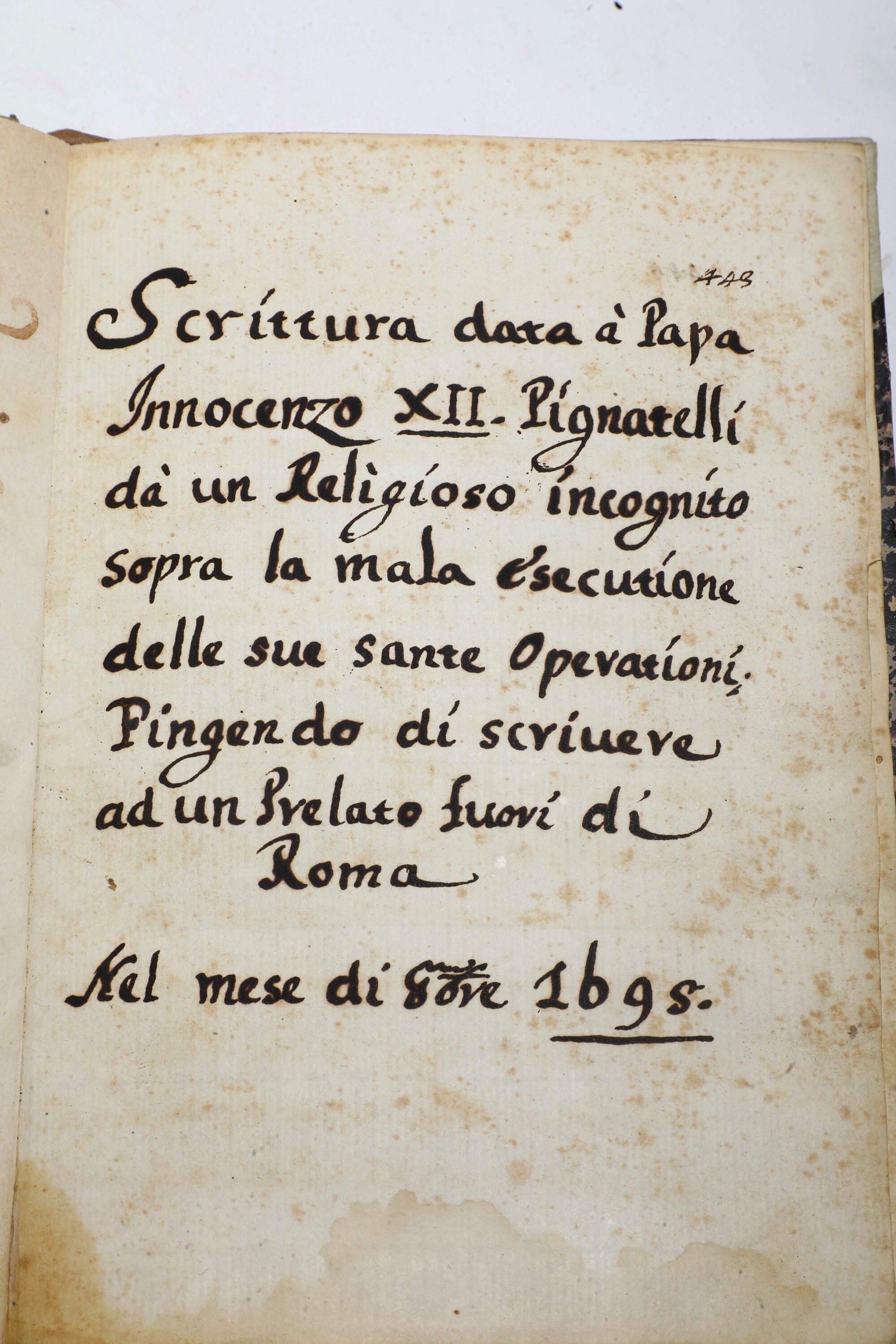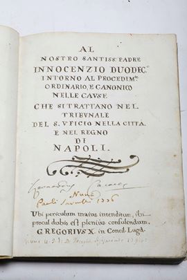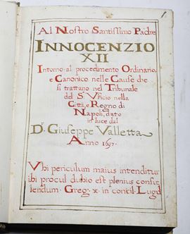Piccola raccolta di manoscritti relativi a Papa Innocenzo XII Al nostro Santissimo Padre..intorno al procedimento ordinario e canonico nelle cause..Regno di Napoli..1694/Al nostro Santissimo Padre..intorno al procedimento ordinario e canonico nelle cause..Regno di Napoli..1697/Scrittura data a Papa Innocenzo XII da un religioso incognito sopra la mala escutione delle sue sante operationi..1698